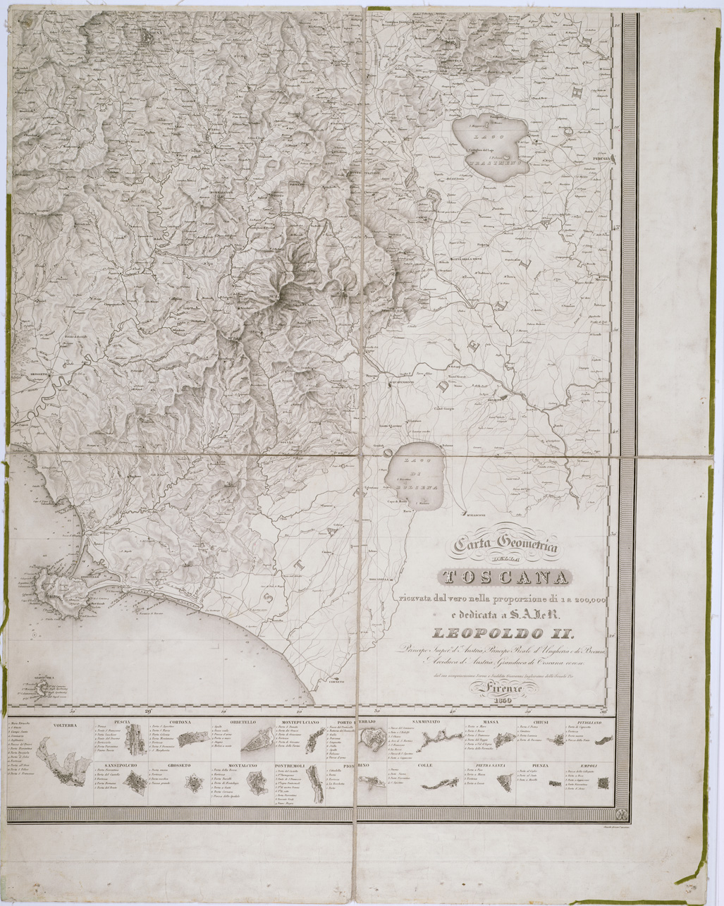 "DEDICATA A S. A. I. E R. LEOPOLDO II PRINCIPE IMPER.LE D'AUSTRIA, ECC., ECC., DAL SUO OSSEQUIOSISSIMO SERVO, ECC., ECC., GIOVANNI INGHIRAMI DELLE SCUOLE PIE. FIRENZE. Quattro fogli incisi su rame, montati su tela a stacchi, stampati in nero. Carta basata su regolare triangolazione e su le mappe catastali eseguite dal 1817 al 1827 a scale variabili da 1:5 000 a 1:625. Proiezione di Bonne. Meridiano medio calcolato a 8° 39' 30'' da Parigi parallelo medio 43° di latitudine Boreale. Longitudini calcolate dal meridiano dell'Isola del Ferro. Orografia rappresentata col tratteggio a luce obliqua. Cfr. MORI A., La Cartografia Ufficiale dell'Italia e l'I.G.M., pagg. 62-63. La nascita di questa importante carta iniziò con l'esecuzione delle prime misure finalizzate al collegamento geodetico delle città di Prato e Pistoia alla piccola rete trigonometrica locale fiorentina, condotte dal padre scolopio Giovanni Inghirami. In circa dieci anni tutte le carte catastali a scale comprese tra 1:5.000 ed 1:625 vennero ridotte alla scala 1:200.000 ed adattate alla corografia toscana con l'assistenza del padre Numa Pompilio Tanzini. Il disegno dei territori insulari fu derivato dalla carta del Puissant, mentre le quote batimetriche lungo la costa tirrenica ed in prossimità delle isole vennero dedotte dai rilevamenti idrografici effettuati dall'ufficiale inglese William Henry Smith (1788-1865), e la planimetria degli stati confinanti venne derivata da vari documenti cartografici disponibili. La carta della Toscana venne ultimata nel 1830 nella proiezione di Bonne, con incisione affidata alle cure di Giocondo Ragazzoni e di Stanislao Stucchi, in quattro fogli, contenenti, oltre alla corografia vera e propria, un ricco apparato fuori margine, con le piante dei principali centri abitati della Toscana delineati alla scala di 1:35.000, una tabella di 216 località con l'"Elevazione dei principali monti e luoghi più ragguardevoli del Granducato sopra il livello del mare in piedi francesi", un quadro dei "caratteri e segni convenzionali", divisi in città, sedi vescovili, comuni, castelli, chiese, luoghi diruti, poste, strade, ponti, fiumi, scogli secche, ecc. ed una descrizione generale dei criteri di formazione adottati (Barsanti D., 1992). Cfr. CANTILE A., Rappresentare e misurare il Mondo. I.G.M., 2004, pagg. 179-180. La stessa carta è nella Coll. Pasqui n. 15 e nella Cart. Arch. n. 68 doc. n. 3. Confronta anche " La Toscana divisa in comunità..." Coll. Pasqui n.16 e 16 bis. Da questa carta derivano anche le carte alle Collezioni Bianconi n.217 e Fossombroni n.4469 (1) dal titolo " Carta Geometrica della Toscana "."