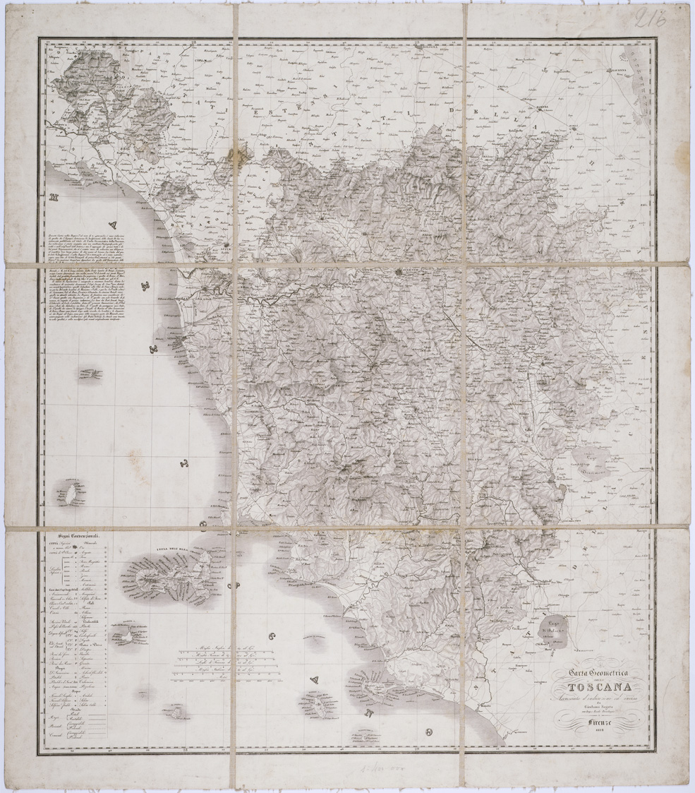 "Riduzione con Pantografo della "Carta Geometrica della Toscana" di G. Inghirami (Collez. Bianconi n. 215 Collez. Pasqui n. 15 Cartella d'Archivio n. 69 Docum. n. 3). Un sol foglio montato su tela a stacchi. A sinistra una nota circa la costruzione della carta e la legenda dei segni convenzionali. La copia Collez. Pasqui n. 19 si compone di sei spezzoni contenuti in busta."