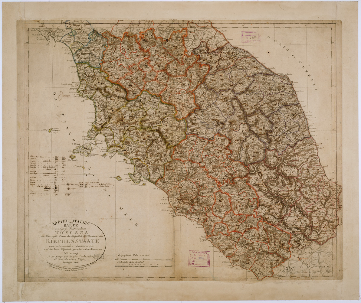 MITTEL ITALIEN ODER KARTE VON GROSS HERZOGTHUM TOSCANA DEM HERZOGTH LUCCA, DER REPUBLICK ST. MARINO U. DEM KIRCHENSTAATE NACH ASTRONOMISCHEN BESTIMMUNGEN UND DEN BESTEN HILFSMITTELN, ECC., ECC., BERICHTIGET - Toscana, Lazio, Calabria, Marche, Abruzzo