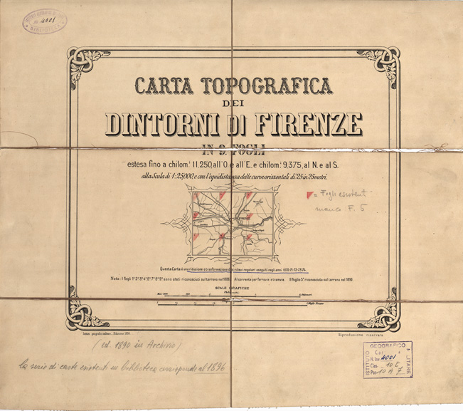 "Estesa fino a chilom.' 11.250, all'O. e all'E., e chilom.' 9.375, al N. e al S. Questa carta è una riduzione o trasformazione dai rilievi regolari eseguiti negli anni 1870-71-72-73-74. I fogli 1°, 2°, 3°, 4°, 6°, 7°, 8°, 9°, sono stati riconosciuti sul terreno nel 1886. Al corrente ferrovie e tramvie. Il foglio 5° riconosciuto sul terreno nel 1890. L'equidistanza delle curve orizzontali è di 25 in 25 metri. Annotazioni sulla carta a matita rossa e a lapis. Manca il foglio 5°."