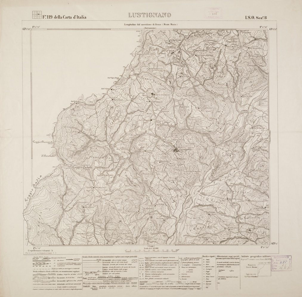 "I.G.M. (FI). Sono dieci sezioni del foglio N° 119 della Carta d' Italia pubblicate in edizione speciale con particolare ricchezza di segni convenzionali relativi a: ferrovie, strade, ponti, muri, condutture di energia elettrica, case, opifici, centrali eletriche, chiese, cappelle, stazioni radiotelegrafiche, miniere, fari e fanali, acquedotti, canali, pozzi, cisterne, abbeveratoi, cascate, boschi e vigneti, ecc. limiti di stato, provincia, circondario e comune, di bosco e di coltura. Stampa in nero. Orografia a curve di livello (equidistanza 5 m per le punteggiate 1 m)."