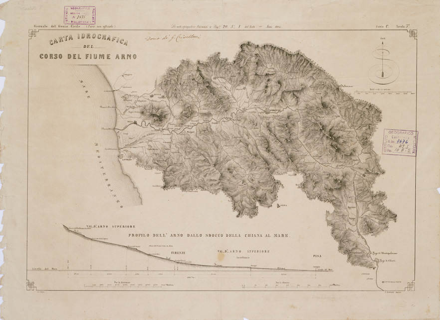 "Rappresentazione orografica a tratteggio. In basso il profilo dell'Arno dallo sbocco della Chiana al mare. Le note spiegative trovansi a pag. 20 n. 1 del testo. Giornale del Genio Civile (parte non ufficiale). Dono di G. Crivellari, I. Bulatri incise."