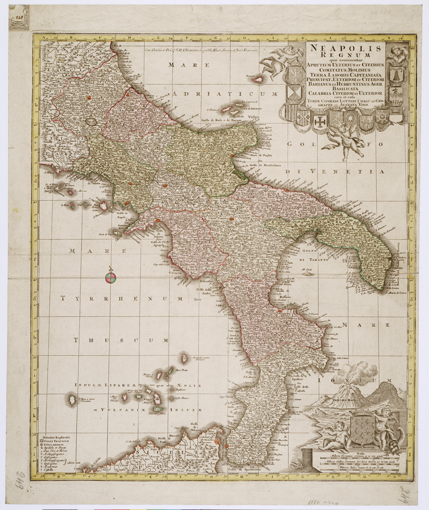 "...COMITATUS MOLISIUS TERRA LABORIS CAPITANATA PRINCIPAT. ULTERIOR ET CITERIOR BARIANUS ET HYDRUNTINUS AGER BASILICATA CALABRIA CITERIOR ET ULTERIOR CURA ET CAELO TOBIAE CONRADI LOTTERI, CHALC ET GEOGRAPHI AUGUSTA VIND. CUM GRATIA ET PRIV. S. R. I. VICARATIUS IN PARTIB. RHENI, SVEVIAE ET JURIS FRANCONICI. (s. d.) Incisione su rame in foglio unico. Orografia prospettica a monticelli. Abitati principali rappresentati in pianta e riempiti in rosso. Manca la rete stradale. Territori e confini politici a colori. In basso a sinistra la leggenda dei segni convenzionali. Cfr. ARRIGONI E BERTARELLI, Le carte geografiche dell'Italia ecc., n. 2255. Cfr. anche la carta al n° d'inv. 2216 Neapolis Regnum quo continentur aprutium ecc. 1730 circa."