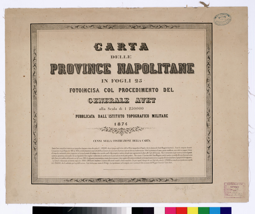 "...IN FOGLI 25 FOTOINCISA COL PROCEDIMENTO DEL GENERALE AVET ALLA SCALA DI 1:250.000 PUBBLICATA DALL'ISTITUTO TOPOGRAFICO MILITARE, 1874. Bella, pregevolissima carta. E' in 25 fogli oltre il foglio titolo. Su di questo sono dati i seguenti " Cenni sulla costruzione della Carta " : "Questa carta corografica è tratta da una topografica disegnata a mano alla scala di 1: 103.680, che si trovava negli Archivi dell ' ex- Ufficio Topografico di Napoli e che era dovuta allo Stato Maggiore Austriaco. Essa fu eseguita durante l ' occupazione di quel Regno dal 1821 al 1824, e ne fu fondamento la nota carta del Rizzi-Zannoni, di cui la Carta Austriaca è per così dire una trasformazione. Difatti la planimetria fu poco o punto modificata ma si dette un maggior rilievo all ' orografia, sostituendo, previe ricognizioni sul terreno, il metodo del tratteggio a luce zenitale, a quello della prospettiva cavaliera col quale sono rappresentate le alture nelle Carte del Zannoni. Non è certamente, né può essere un lavoro di grande esattezza geometrica, come quello che non dipende da rilievi regolari e molto meno da coordinazione di questi ad una rete di punti geodetici. Nonostante il Comitato dello Stato Maggiore credè di rendere un servizio alle varie Amministrazioni dello Stato ed al pubblico, deliberando, sin dall ' anno 1868, di utilizzarla (in via transitoria e intanto che si compivano i rilievi regolari nelle provincie meridionali) con lo scopo di somministrare una guida sufficiente al militare, al geografo ed al viaggiatore. La carta fu riconosciuta sul terreno negli anni 1868-1869 onde completarvi il sistema delle strade rotabili a fondo manufatto. Di poi si operò il disegno dei vari fogli alla scala di 1: 250.000, che fu adottata per la pubblicazione. Così ridotta essa consta di 25 fogli. La riproduzione ne fu eseguita con il sistema di fotoincisione del Maggior Generale Conte Avet ". (vedi: N. 39 d'Ordine, Cart. d'Arch. N° 71 - Docum. N° 9021 - Files A0001415-1491, e N. 61 d' Ordine, Cart. d 'Arch. N° 72 Docum. N° 9022 - Files A0001537-1594). Alla carta è unito un quadro di unione. Due copie, una delle quali incompleta e l'altra, completa, riveduta dal 1882-1884. La carta completa si trova in biblioteca è montata su tela a stacchi n. di inventario generale 50, schedario carte generali Italia. In archivio (Cart. d'Arch. N. 90 - Docum. n. 26 - Files A0002825-2844) si trova la copia parziale delle carte (mancano i seguenti fogli: 9, 13, 15, 16, 17, 20, 25) non è montata su tela."