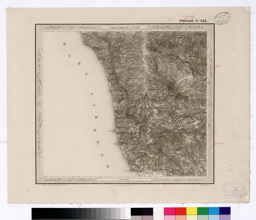 "...IN FOGLI 25 FOTOINCISA COL PROCEDIMENTO DEL GENERALE AVET ALLA SCALA DI 1:250.000 PUBBLICATA DALL'ISTITUTO TOPOGRAFICO MILITARE, 1874. Bella, pregevolissima carta. E' in 25 fogli oltre il foglio titolo. Su di questo sono dati i seguenti " Cenni sulla costruzione della Carta " : "Questa carta corografica è tratta da una topografica disegnata a mano alla scala di 1: 103.680, che si trovava negli Archivi dell ' ex- Ufficio Topografico di Napoli e che era dovuta allo Stato Maggiore Austriaco. Essa fu eseguita durante l ' occupazione di quel Regno dal 1821 al 1824, e ne fu fondamento la nota carta del Rizzi-Zannoni, di cui la Carta Austriaca è per così dire una trasformazione. Difatti la planimetria fu poco o punto modificata ma si dette un maggior rilievo all ' orografia, sostituendo, previe ricognizioni sul terreno, il metodo del tratteggio a luce zenitale, a quello della prospettiva cavaliera col quale sono rappresentate le alture nelle Carte del Zannoni. Non è certamente, né può essere un lavoro di grande esattezza geometrica, come quello che non dipende da rilievi regolari e molto meno da coordinazione di questi ad una rete di punti geodetici. Nonostante il Comitato dello Stato Maggiore credè di rendere un servizio alle varie Amministrazioni dello Stato ed al pubblico, deliberando, sin dall ' anno 1868, di utilizzarla (in via transitoria e intanto che si compivano i rilievi regolari nelle provincie meridionali) con lo scopo di somministrare una guida sufficiente al militare, al geografo ed al viaggiatore. La carta fu riconosciuta sul terreno negli anni 1868-1869 onde completarvi il sistema delle strade rotabili a fondo manufatto. Di poi si operò il disegno dei vari fogli alla scala di 1: 250.000, che fu adottata per la pubblicazione. Così ridotta essa consta di 25 fogli. La riproduzione ne fu eseguita con il sistema di fotoincisione del Maggior Generale Conte Avet ". (vedi: N. 39 d'Ordine, Cart. d'Arch. N° 71 - Docum. N° 9021 - Files A0001415-1491, e N. 61 d' Ordine, Cart. d 'Arch. N° 72 Docum. N° 9022 - Files A0001537-1594). Alla carta è unito un quadro di unione. Due copie, una delle quali incompleta e l'altra, completa, riveduta dal 1882-1884. La carta completa si trova in biblioteca è montata su tela a stacchi n. di inventario generale 50, schedario carte generali Italia. In archivio (Cart. d'Arch. N. 90 - Docum. n. 26 - Files A0002825-2844) si trova la copia parziale delle carte (mancano i seguenti fogli: 9, 13, 15, 16, 17, 20, 25) non è montata su tela."