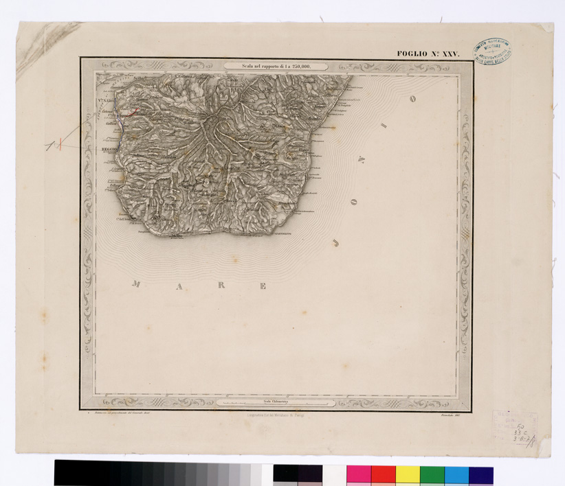 "...IN FOGLI 25 FOTOINCISA COL PROCEDIMENTO DEL GENERALE AVET ALLA SCALA DI 1:250.000 PUBBLICATA DALL'ISTITUTO TOPOGRAFICO MILITARE, 1874. Bella, pregevolissima carta. E' in 25 fogli oltre il foglio titolo. Su di questo sono dati i seguenti " Cenni sulla costruzione della Carta " : "Questa carta corografica è tratta da una topografica disegnata a mano alla scala di 1: 103.680, che si trovava negli Archivi dell ' ex- Ufficio Topografico di Napoli e che era dovuta allo Stato Maggiore Austriaco. Essa fu eseguita durante l ' occupazione di quel Regno dal 1821 al 1824, e ne fu fondamento la nota carta del Rizzi-Zannoni, di cui la Carta Austriaca è per così dire una trasformazione. Difatti la planimetria fu poco o punto modificata ma si dette un maggior rilievo all ' orografia, sostituendo, previe ricognizioni sul terreno, il metodo del tratteggio a luce zenitale, a quello della prospettiva cavaliera col quale sono rappresentate le alture nelle Carte del Zannoni. Non è certamente, né può essere un lavoro di grande esattezza geometrica, come quello che non dipende da rilievi regolari e molto meno da coordinazione di questi ad una rete di punti geodetici. Nonostante il Comitato dello Stato Maggiore credè di rendere un servizio alle varie Amministrazioni dello Stato ed al pubblico, deliberando, sin dall ' anno 1868, di utilizzarla (in via transitoria e intanto che si compivano i rilievi regolari nelle provincie meridionali) con lo scopo di somministrare una guida sufficiente al militare, al geografo ed al viaggiatore. La carta fu riconosciuta sul terreno negli anni 1868-1869 onde completarvi il sistema delle strade rotabili a fondo manufatto. Di poi si operò il disegno dei vari fogli alla scala di 1: 250.000, che fu adottata per la pubblicazione. Così ridotta essa consta di 25 fogli. La riproduzione ne fu eseguita con il sistema di fotoincisione del Maggior Generale Conte Avet ". (vedi: N. 39 d'Ordine, Cart. d'Arch. N° 71 - Docum. N° 9021 - Files A0001415-1491, e N. 61 d' Ordine, Cart. d 'Arch. N° 72 Docum. N° 9022 - Files A0001537-1594). Alla carta è unito un quadro di unione. Due copie, una delle quali incompleta e l'altra, completa, riveduta dal 1882-1884. La carta completa si trova in biblioteca è montata su tela a stacchi n. di inventario generale 50, schedario carte generali Italia. In archivio (Cart. d'Arch. N. 90 - Docum. n. 26 - Files A0002825-2844) si trova la copia parziale delle carte (mancano i seguenti fogli: 9, 13, 15, 16, 17, 20, 25) non è montata su tela."