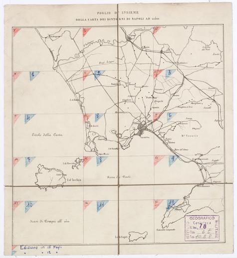 "...LEVATA PER ORDINE DI S. M. FERDINANDO I RE DEL REGNO DELLE DUE SICILIE DAGLI UFFIZIALI DELLO STATO MAGGIORE E DALL'INGEGNERI TOPOGRAFI NEGLI ANNI 1817-1818-1819 DISEGNATA ED INCISA NELL'OFFICIO TOPOGRAFICO DI NAPOLI. Questa carta si compone di 15 fogli (in origine 9, e poi portati a 12) incisi su rame, stampati in nero. Essa è basata sulle mappe catastali già esistenti al 10.000, ridotte alla scala di 1: 20.000, riconosciute sul terreno e poggiate sui lavori di triangolazione eseguiti dal 1816 al 1819 nel territorio di Napoli, con aggiunta dei rilievi idrografici lungo le coste del Golfo e delle Isole. Le longitudini sono calcolate dal meridiano del R. Osservatorio di Napoli. L ' orografia è rappresentata con fine tratteggio a luce obliqua. Gli scandagli sono calcolati in passi. La carta è notevole per la chiarezza del disegno. Essa mostra centri abitati, strade, fiumi, colture e vegetazioni, ecc., con particolare ricchezza di dettagli. IL foglio N° 7 contiene il titolo e varie "piante delle principali antichità del territorio di Pozzuoli". Il foglio N° 10 contiene l ' Isola d ' Ischia il foglio N° 11 la rosa dei venti il foglio N° 13 la " Pianta degli scavi di Pompei nello stato in cui si trovano alla fine del 1875. Delineata ed incisa nel R. Officio Topografico della guerra. Napoli" alla scala di 1: 2.000 il foglio N° 14 l'Isola di Capri. Due copie d'Archivio (Cart. d ' Arch. N° 86, Docum. N° 14) una delle quali incompleta con la pianta di Pompei a data imprecisata 184.. Altre due copie (N° 78 d 'inv. gen.) sono pure incomplete con la pianta di Pompei alla data 1875 e annesso un quadro d ' unione."