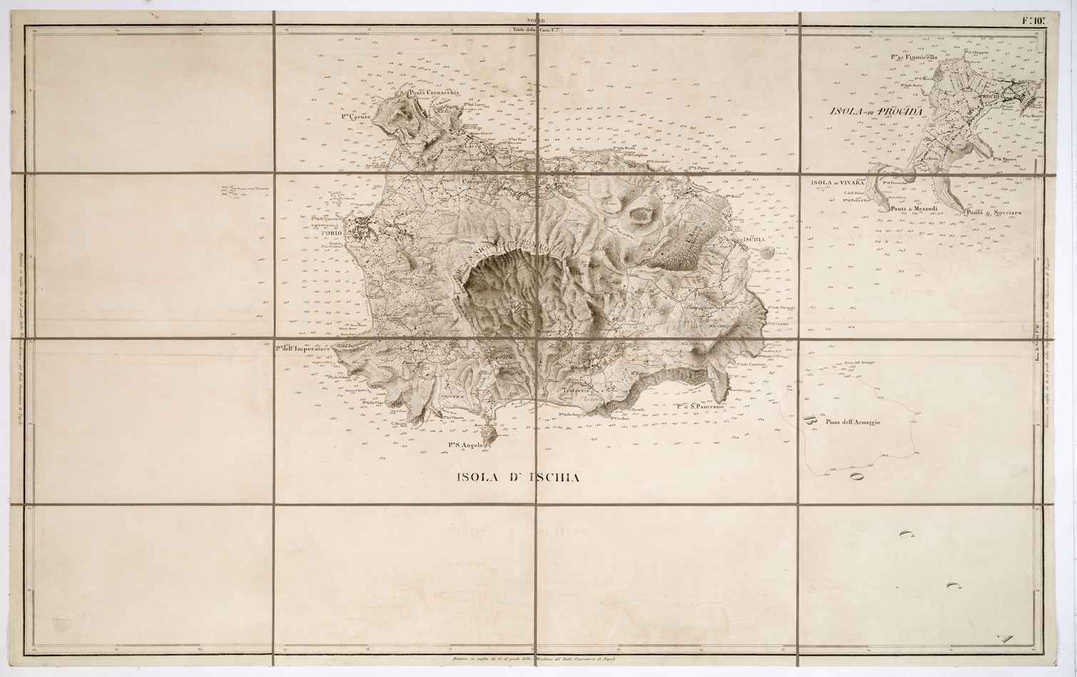 "...LEVATA PER ORDINE DI S. M. FERDINANDO I RE DEL REGNO DELLE DUE SICILIE DAGLI UFFIZIALI DELLO STATO MAGGIORE E DALL'INGEGNERI TOPOGRAFI NEGLI ANNI 1817-1818-1819 DISEGNATA ED INCISA NELL'OFFICIO TOPOGRAFICO DI NAPOLI. Questa carta si compone di 15 fogli (in origine 9, e poi portati a 12) incisi su rame, stampati in nero. Essa è basata sulle mappe catastali già esistenti al 10.000, ridotte alla scala di 1: 20.000, riconosciute sul terreno e poggiate sui lavori di triangolazione eseguiti dal 1816 al 1819 nel territorio di Napoli, con aggiunta dei rilievi idrografici lungo le coste del Golfo e delle Isole. Le longitudini sono calcolate dal meridiano del R. Osservatorio di Napoli. L ' orografia è rappresentata con fine tratteggio a luce obliqua. Gli scandagli sono calcolati in passi. La carta è notevole per la chiarezza del disegno. Essa mostra centri abitati, strade, fiumi, colture e vegetazioni, ecc., con particolare ricchezza di dettagli. IL foglio N° 7 contiene il titolo e varie "piante delle principali antichità del territorio di Pozzuoli". Il foglio N° 10 contiene l ' Isola d ' Ischia il foglio N° 11 la rosa dei venti il foglio N° 13 la " Pianta degli scavi di Pompei nello stato in cui si trovano alla fine del 1875. Delineata ed incisa nel R. Officio Topografico della guerra. Napoli" alla scala di 1: 2.000 il foglio N° 14 l'Isola di Capri. Due copie d'Archivio (Cart. d ' Arch. N° 86, Docum. N° 14) una delle quali incompleta con la pianta di Pompei a data imprecisata 184.. Altre due copie (N° 78 d ' inv. gen.) sono pure incomplete con la pianta di Pompei alla data 1875 e annesso un quadro d ' unione."