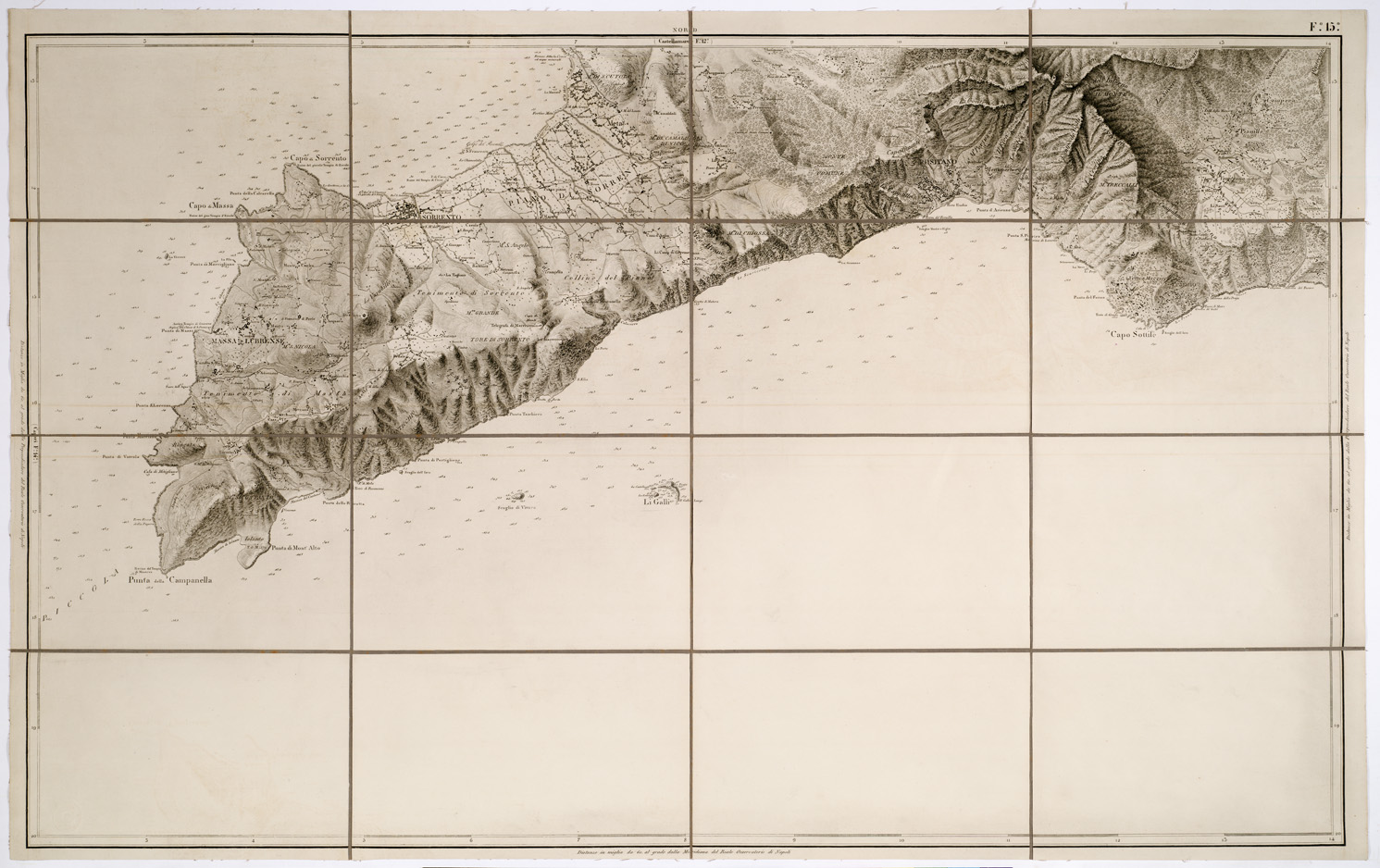 "...LEVATA PER ORDINE DI S. M. FERDINANDO I RE DEL REGNO DELLE DUE SICILIE DAGLI UFFIZIALI DELLO STATO MAGGIORE E DALL'INGEGNERI TOPOGRAFI NEGLI ANNI 1817-1818-1819 DISEGNATA ED INCISA NELL'OFFICIO TOPOGRAFICO DI NAPOLI. Questa carta si compone di 15 fogli (in origine 9, e poi portati a 12) incisi su rame, stampati in nero. Essa è basata sulle mappe catastali già esistenti al 10.000, ridotte alla scala di 1: 20.000, riconosciute sul terreno e poggiate sui lavori di triangolazione eseguiti dal 1816 al 1819 nel territorio di Napoli, con aggiunta dei rilievi idrografici lungo le coste del Golfo e delle Isole. Le longitudini sono calcolate dal meridiano del R. Osservatorio di Napoli. L ' orografia è rappresentata con fine tratteggio a luce obliqua. Gli scandagli sono calcolati in passi. La carta è notevole per la chiarezza del disegno. Essa mostra centri abitati, strade, fiumi, colture e vegetazioni, ecc., con particolare ricchezza di dettagli. IL foglio N° 7 contiene il titolo e varie "piante delle principali antichità del territorio di Pozzuoli". Il foglio N° 10 contiene l ' Isola d ' Ischia il foglio N° 11 la rosa dei venti il foglio N° 13 la " Pianta degli scavi di Pompei nello stato in cui si trovano alla fine del 1875. Delineata ed incisa nel R. Officio Topografico della guerra. Napoli" alla scala di 1: 2.000 il foglio N° 14 l'Isola di Capri. Due copie d'Archivio (Cart. d ' Arch. N° 86, Docum. N° 14) una delle quali incompleta con la pianta di Pompei a data imprecisata 184.. Altre due copie (N° 78 d ' inv. gen.) sono pure incomplete con la pianta di Pompei alla data 1875 e annesso un quadro d ' unione."