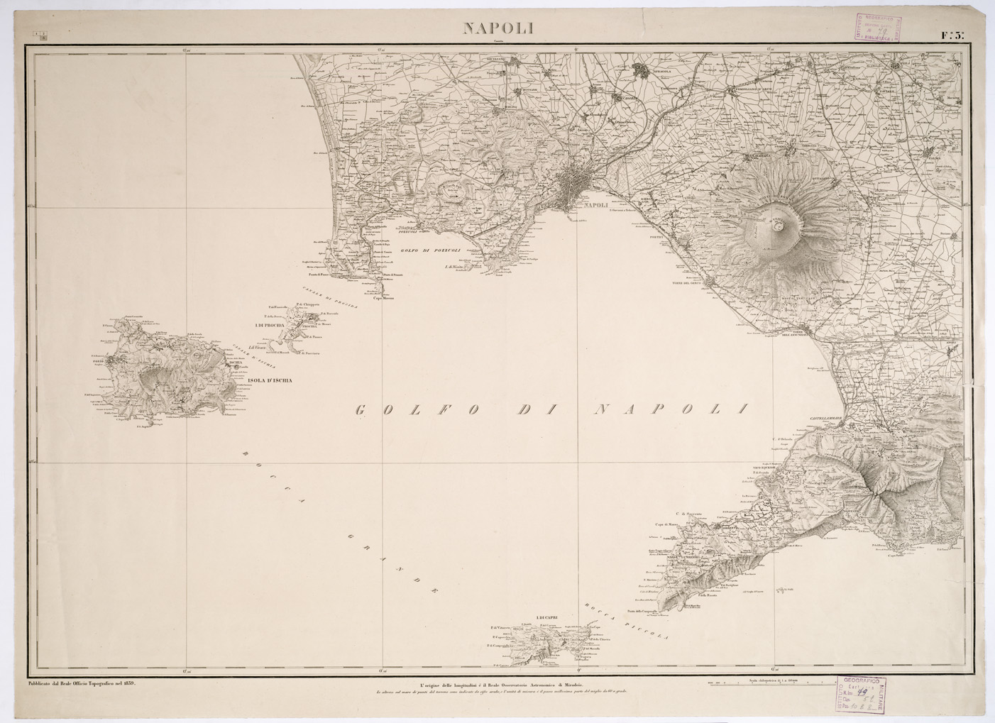 "Otto fogli pubblicati dal 1839 al 1875, parte dal Reale Officio Topografico di Napoli, alcuni dall ' Ufficio Superiore dello Stato Maggiore, Sezione di Napoli, uno dall ' Istituto Topografico Militare taluni sono incompleti. Essi sono gli unici fogli iniziati della progettata carta del Regno di Napoli all'80.000 (v. N° 43 d ' ordine, Cart. d ' Arch. N.i. 77-80. Docum. N° 9). L'orografia vi è rappresentata col tratteggio a luce obliqua con aggiunta delle curve di livello tracciate all'equidistanza di 10 passi. Annessi frammenti della carta originale disegnati per i fogli I e IV. La copia N° 79 d'inv. gen. consta dei fogli, in duplicato N.i. 1, 2, 3 (Gaeta, Caserta, Napoli) pubblicati dal Reale Officio Topografico rispettivamente nel 1858, 1875 e 1839. Questa copia si trova in biblioteca ed è indicata dal numero di inventario generale n° 79. Una copia è alla Cart. d'Arch n. 86, Docum. n. 13."