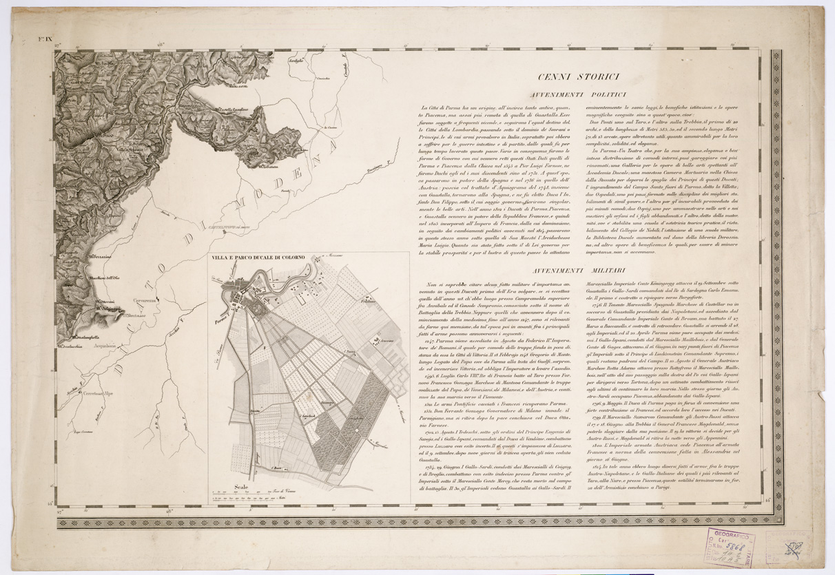 "...LEVATA DIETRO MISURE TRIGONOMETRICHE NEGLI ANNI 1821 E 1822 SOTTO IL GOVERNO DI SUA MAESTA' L'ARCIDUCHESSA MARIA LUIGIA, DISEGNATA ED INCISA IN MILANO NELL'I.G.M. DELL'I. R. STATO MAGGIORE AUSTRIACO, PUBBLICATA NELL'ANNO 1828. Carta in nove fogli incisa su rame analoga a quelle del Lombardo Veneto e del Ducato di Modena alla stessa scala (v. Lombardo-Veneto, N° 81 d'ordine, Cart. d'Arch. N.i 52 e 53, Docum. 2 e 4 e Parma Piacenza e Modena N° 10 d'ordine, Cart. d'Arch. N° 54 Docum. N.i 7 e 8). Due copie: la carta N° 5 è " rettificata col nuovo riparto territoriale nell'anno 1849". Annesso un quadro d'unione costruito nell'anno 1885 dall'I.G.M. di Firenze essendone la carta priva (Cfr. MORI A., La cartografia Ufficiale in Italia, e l'I.G.M., pag. 58). Una copia si trova alla Cart. d'Arch. N° 53 Docum. N.i 5 e 6 (file A0001071-1080)."