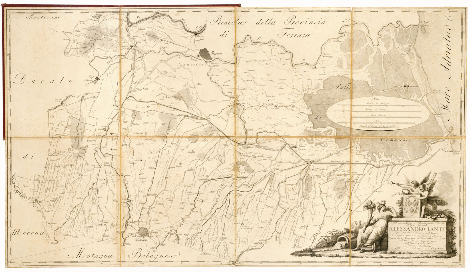 "Incisione su rame di G. Rosaspina e F. Giani dedicata al Cardinale Alessandro Lante dall'Ingegnere Barbantini. Foglio unico. La copia N° 11 Collezione Pasqui (Files B0002362-62), montata su tela e contenuta in libretto, è stampata in nero. La copia N° 205 Collezione Bianconi (Files B0002304-05) è a colori. Quattro scale grafiche in pertiche di Bologna e di Ferrara, in palmi romani e in metri."