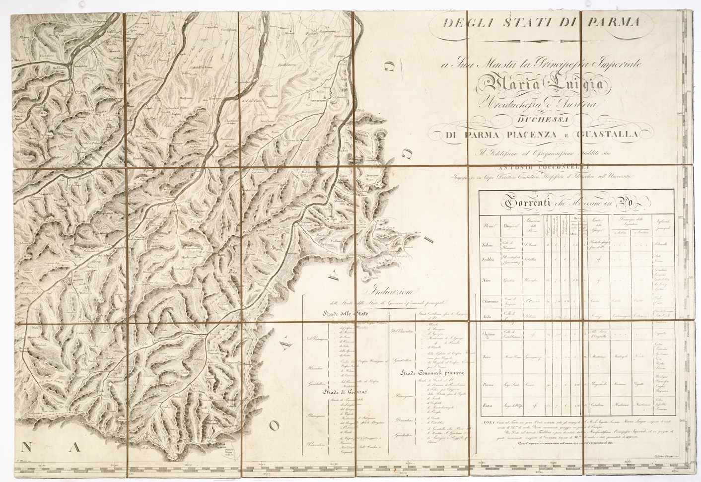 "IL FEDELISSIMO,ECC., ANTONIO COCCONCELLI INGEGNERE IN CAPO DIRETTORE CONSULTORE PROFESSORE DI IDRAULICA DELL'UNIVERSITA'. Grande carta incisa su rame da G. Silvestri, montata su tela stacchi, orientazione normale. Longitudini calcolate sul meridiano dell'Isola del Ferro. Orografia rappresentata mediante tratteggio a luce obliqua. Abitati distinti in base alla loro importanza amministrativa. Sono tracciate le strade e indicati i confini. In basso a sinistra la seguente nota: " La presente carta, estratta dai tipi del Catasto, de Confini, e de' Ponti e Strade, e dalla carta Tocchi del Piacentino, e rettificata con grandi triangoli e colle latitudini e longitudini della citta', e principali Borgate è esatta, quanto richiedesi in una Carta amministrativa". La carta è corredata di quadri su la popolazione, le strade, i torrenti. Scale grafiche in miglia comuni, miglia geografiche e in metri. Le due copie della collezione Regalia sono in quattro fogli montati su tela, piegati e contenuti in libretto o in busta. "