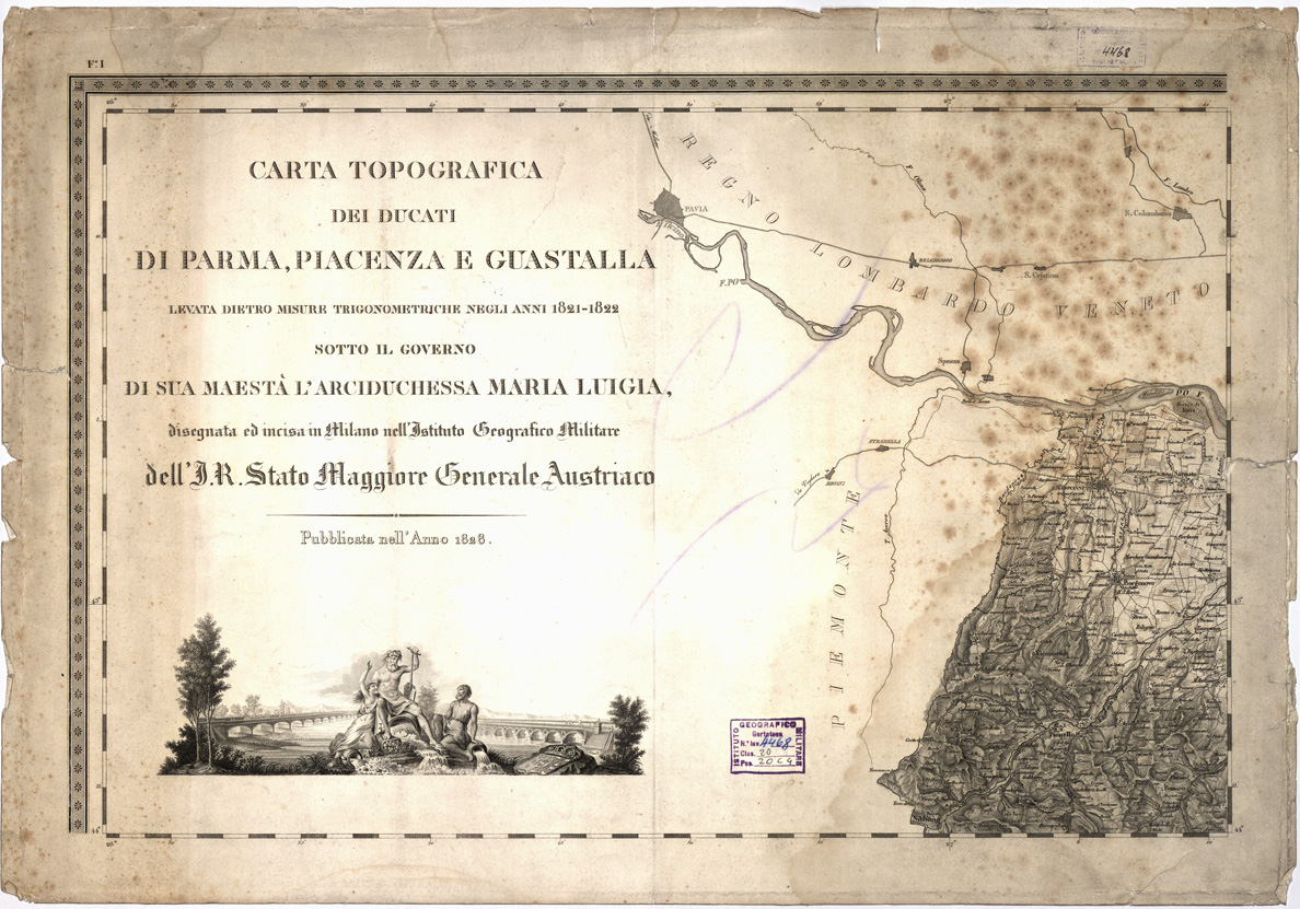 "....LEVATA DIETRO MISURE TRIGONOMETRICHE NEGLI ANNI 1821 E 1822 SOTTO IL GOVERNO DI SUA MAESTA' L'ARCIDUCHESSA MARIA LUIGIA, DISEGNATA ED INCISA IN MILANO NELL'I.G.M. DELL'I. R. STATO MAGGIORE AUSTRIACO, PUBBLICATA NELL'ANNO 1828. Carta in nove fogli incisa su rame analoga a quelle del Lombardo Veneto e del Ducato di Modena alla stessa scala (v. Lombardo-Veneto, N° 81 d'ordine, Cart. d'Arch. N.i 52 e 53, Docum. Numeri 2 e 4 e Parma Piacenza e Modena N° 10 d'ordine, Cart. d'Arch. N° 54 Docum. N.i 7 e 8). Due copie: la carta N° 5 è "rettificata col nuovo riparto territoriale nell'anno 1849". Annesso un quadro d'unione costruito nell'anno 1885 dall'I.G.M. di Firenze essendone la carta priva. Cfr. MORI A., La Cartografia Ufficiale in Italia, e l'I.G.M., pag. 58. Una di queste copie si trova in biblioteca."