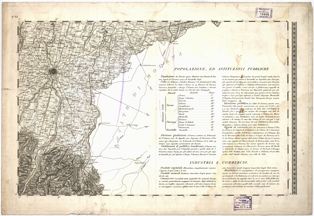 "...LEVATA DIETRO MISURE TRIGONOMETRICHE NEGLI ANNI 1821 E 1822 SOTTO IL GOVERNO DI SUA MAESTA' L'ARCIDUCHESSA MARIA LUIGIA, DISEGNATA ED INCISA IN MILANO NELL'I.G.M. DELL'I. R. STATO MAGGIORE AUSTRIACO, PUBBLICATA NELL'ANNO 1828. Carta in nove fogli incisa su rame analoga a quelle del Lombardo Veneto e del Ducato di Modena alla stessa scala (v. Lombardo-Veneto, N° 81 d'ordine, Cart. d'Arch. N.i 52 e 53, Docum. Numeri 2 e 4 e Parma Piacenza e Modena N° 10 d'ordine, Cart. d'Arch. N° 54 Docum. N.i 7 e 8). Due copie: la carta N° 5 è "rettificata col nuovo riparto territoriale nell'anno 1849". Annesso un quadro d'unione costruito nell'anno 1885 dall'I.G.M. di Firenze essendone la carta priva. Cfr. MORI A., La Cartografia Ufficiale in Italia, e l'I.G.M., pag. 58. Una di queste copie si trova in biblioteca."