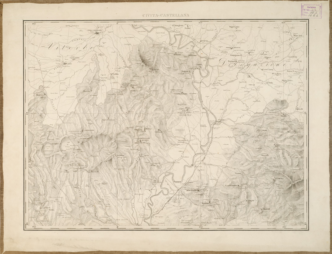 "...ED INCISA NELL'OFFICIO DEL CENSO ALLA SCALA 1:80.000 L'ANNO XVII DEL PONTIFICATO DI N. SIGNORE PAPA PIO IX PER ORDINE DELL E.MO E R.MO PRESIDENTE CARDINALE GIUSEPPE BOFONDI. Carta in nove fogli (dei quali uno per il titolo) incisi su rame alla Calcografia Camerale. I titoli sono: Roma, Civita-Castellana, Civita - Vecchia, Nettuno, Palo, Subiaco, Arsoli, Cisterna. Le longitudini sono calcolate dal meridiano della Cupola di S. Pietro in Vaticano. Ciascun foglio contiene 19' di latitudine e 34' di longitudine. La carta è basata sui rilievi catastali eseguiti in seguito al motu proprio del 1816. Fu pubblicata nel 1845. L'orografia è rappresentata con fine tratteggio a luce zenitale. Gli abitati sono distinti in base alla loro importanza amministrativa. Le strade sono distinte in sei classi comprese le ferrovie. Sono indicati i confini politici e amministrativi, i boschi, i vigneti, le saline, i punti trigonometrici, ecc. il foglio N° 1 contiene il titolo, la leggenda dei segni convenzionali, il quadro d'unione e le scale grafiche. Cfr. MORI A., La cartografia ufficiale in Italia e l'I.G.M., pag. 79. Quattro copie una delle quali montata su tela a stacchi. Un'altra copia si trova sempre in Biblioteca con il numero di inventario 4080 bis (Files B0002790-98) ed una alla cartella d'Archivio n. 70 - Documento n. 13(A0001301-09)."