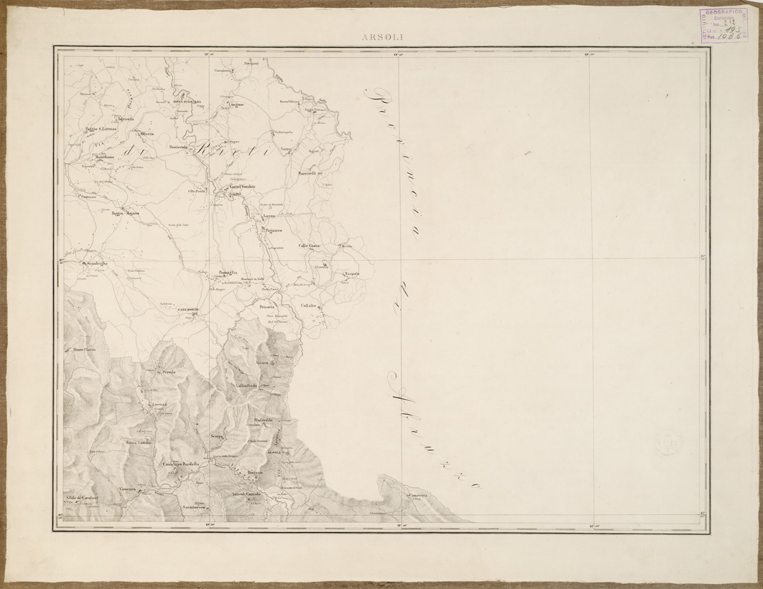 "...ED INCISA NELL'OFFICIO DEL CENSO ALLA SCALA 1:80.000 L'ANNO XVII DEL PONTIFICATO DI N. SIGNORE PAPA PIO IX PER ORDINE DELL E.MO E R.MO PRESIDENTE CARDINALE GIUSEPPE BOFONDI. Carta in nove fogli (dei quali uno per il titolo) incisi su rame alla Calcografia Camerale. I titoli sono: Roma, Civita-Castellana, Civita - Vecchia, Nettuno, Palo, Subiaco, Arsoli, Cisterna. Le longitudini sono calcolate dal meridiano della Cupola di S. Pietro in Vaticano. Ciascun foglio contiene 19' di latitudine e 34' di longitudine. La carta è basata sui rilievi catastali eseguiti in seguito al motu proprio del 1816. Fu pubblicata nel 1845. L'orografia è rappresentata con fine tratteggio a luce zenitale. Gli abitati sono distinti in base alla loro importanza amministrativa. Le strade sono distinte in sei classi comprese le ferrovie. Sono indicati i confini politici e amministrativi, i boschi, i vigneti, le saline, i punti trigonometrici, ecc. il foglio N° 1 contiene il titolo, la leggenda dei segni convenzionali, il quadro d'unione e le scale grafiche. Cfr. MORI A., La cartografia ufficiale in Italia e l'I.G.M., pag. 79. Quattro copie una delle quali montata su tela a stacchi. Un'altra copia si trova sempre in Biblioteca con il numero di inventario 4080 bis (Files B0002790-98) ed una alla cartella d'Archivio n. 70 - Documento n. 13(A0001301-09)."