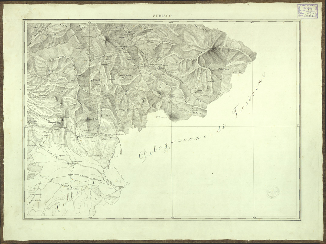"...ED INCISA NELL'OFFICIO DEL CENSO ALLA SCALA 1:80.000 L'ANNO XVII DEL PONTIFICATO DI N. SIGNORE PAPA PIO IX PER ORDINE DELL E.MO E R.MO PRESIDENTE CARDINALE GIUSEPPE BOFONDI. Carta in nove fogli (dei quali uno per il titolo) incisi su rame alla Calcografia Camerale. I titoli sono: Roma, Civita-Castellana, Civita - Vecchia, Nettuno, Palo, Subiaco, Arsoli, Cisterna. Le longitudini sono calcolate dal meridiano della Cupola di S. Pietro in Vaticano. Ciascun foglio contiene 19' di latitudine e 34' di longitudine. La carta è basata sui rilievi catastali eseguiti in seguito al motu proprio del 1816. Fu pubblicata nel 1845. L'orografia è rappresentata con fine tratteggio a luce zenitale. Gli abitati sono distinti in base alla loro importanza amministrativa. Le strade sono distinte in sei classi comprese le ferrovie. Sono indicati i confini politici e amministrativi, i boschi, i vigneti, le saline, i punti trigonometrici, ecc. il foglio N° 1 contiene il titolo, la leggenda dei segni convenzionali, il quadro d'unione e le scale grafiche. Cfr. MORI A., La cartografia ufficiale in Italia e l'I.G.M., pag. 79. Quattro copie una delle quali montata su tela a stacchi. Un'altra copia si trova sempre in Biblioteca con il numero di inventario 4080 bis (Files B0002790-98) ed una alla cartella d'Archivio n. 70 - Documento n. 13(A0001301-09)."