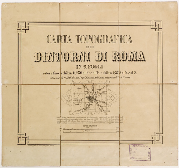 "Carta in 9 fogli estesa fino a chilometri 11.250 all'O. e all'E., e chilometri 9.375 al N. e al S. Questa carta è una riduzione o trasformazione dei rilievi regolari eseguiti negli anni 1872-73-74 dagli impiegati dell'Istituto topografico militare alle scale di 1:10.000 e di 1:25.000 e con l'equidistanza delle curve orizzontali di 5 in 5 metri. Essa fu portata al corrente delle variazioni stradali ed edilizie fino a tutto il 1875 e pubblicata mediante l'incisione su pietra a colori nello Stabilimento Wurster Randegger e C. in Winterthur. La stessa carta risulta essere archiviata in Biblioteca al numero d'Inv. Gen. 210 - n. 92 d'Ordine - Posizione 10-B-5."