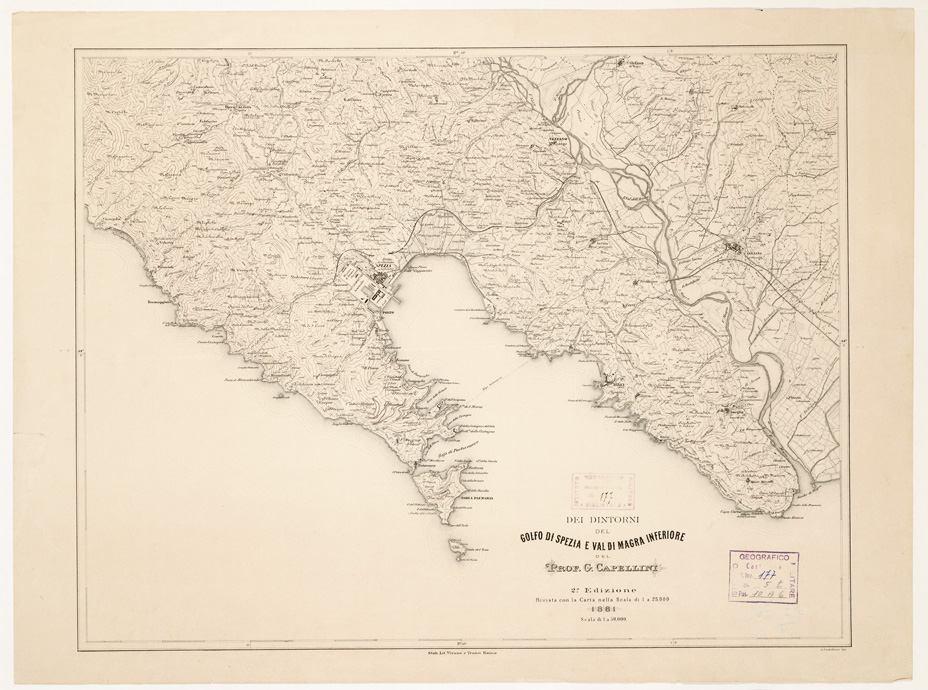 "...DEL PROF. G. CAPELLINI. II^ EDIZIONE RIVISTA CON LA CARTA NELLA SCALA DI 1:25.000, STAB. LIT. VIRANO E TEANO, ROMA. Un foglio riprodotto in litografia, stampato in nero con orografia a curve di livello tracciate in bistro. Incisione di A. Casteliano. "