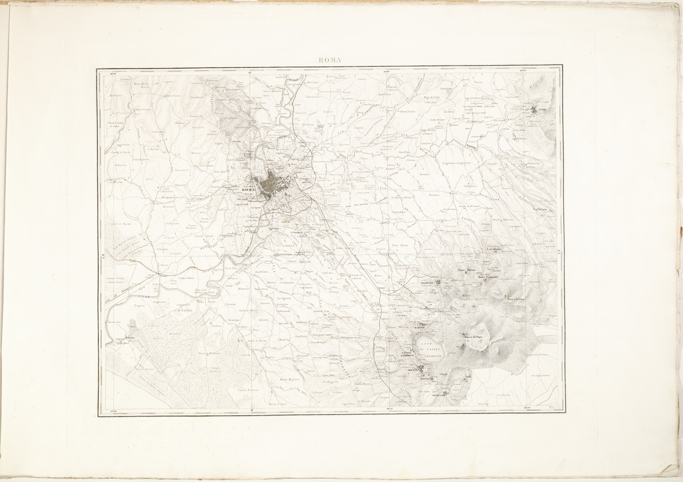 "...DISEGNATA ED INCISA NELL'OFFICIO DEL CENSO ALLA SCALA DI 1:80.000 L'ANNO XVII DEL PONTIFICATO DI N. SIGNORE PAPA PIO IX PER ORDINE DELL'E.MO E R.MO PRESIDENTE CARDINALE GIUSEPPE BOFONDI. Carta in nove fogli (dei quali uno per il titolo) incisi su rame alla Calcografia Camerale. I titoli sono: Roma, Civita-Castellana, Civita - Vecchia, Nettuno, Palo, Subiaco, Arsoli, Cisterna. Le longitudini sono calcolate dal meridiano della Cupola di S. Pietro in Vaticano. Ciascun foglio contiene 19' di latitudine e 34' di longitudine. La carta è basata sui rilievi catastali eseguiti in seguito al motu proprio del 1816. Fu pubblicata nel 1845. L'orografia è rappresentata con fine tratteggio a luce zenitale. Gli abitati sono distinti in base alla loro importanza amministrativa. Le strade sono distinte in sei classi comprese le ferrovie. Sono indicati i confini politici e amministrativi, i boschi, i vigneti, le saline, i punti trigonometrici, ecc. il foglio N° 1 contiene il titolo, la leggenda dei segni convenzionali, il quadro d'unione e le scale grafiche. Cfr. MORI A. La cartografia ufficiale in Italia e l'I.G.M., pag. 79. Quattro copie una delle quali montata su tela a stacchi. Carte uguali a questa si trovano al n. 212 d'inventario generale (Files B0002547-55) ed alla cartella d'archivio n. 70 documento n. 13(A0001301-09)."