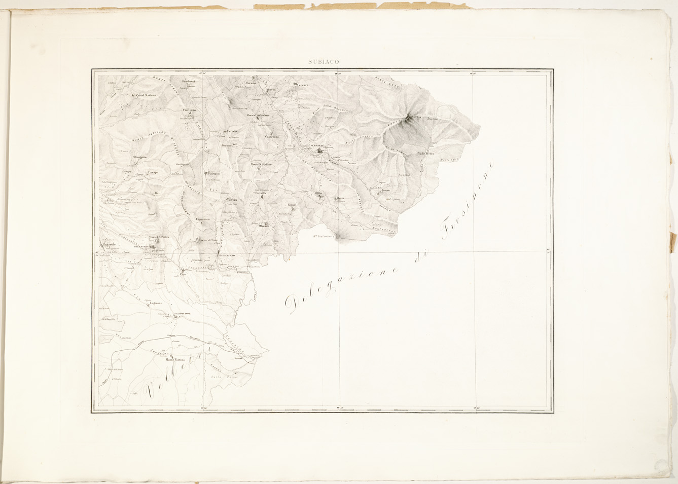 "...DISEGNATA ED INCISA NELL'OFFICIO DEL CENSO ALLA SCALA DI 1:80.000 L'ANNO XVII DEL PONTIFICATO DI N. SIGNORE PAPA PIO IX PER ORDINE DELL'E.MO E R.MO PRESIDENTE CARDINALE GIUSEPPE BOFONDI. Carta in nove fogli (dei quali uno per il titolo) incisi su rame alla Calcografia Camerale. I titoli sono: Roma, Civita-Castellana, Civita - Vecchia, Nettuno, Palo, Subiaco, Arsoli, Cisterna. Le longitudini sono calcolate dal meridiano della Cupola di S. Pietro in Vaticano. Ciascun foglio contiene 19' di latitudine e 34' di longitudine. La carta è basata sui rilievi catastali eseguiti in seguito al motu proprio del 1816. Fu pubblicata nel 1845. L'orografia è rappresentata con fine tratteggio a luce zenitale. Gli abitati sono distinti in base alla loro importanza amministrativa. Le strade sono distinte in sei classi comprese le ferrovie. Sono indicati i confini politici e amministrativi, i boschi, i vigneti, le saline, i punti trigonometrici, ecc. il foglio N° 1 contiene il titolo, la leggenda dei segni convenzionali, il quadro d'unione e le scale grafiche. Cfr. MORI A. La cartografia ufficiale in Italia e l'I.G.M., pag. 79. Quattro copie una delle quali montata su tela a stacchi. Carte uguali a questa si trovano al n. 212 d'inventario generale (Files B0002547-55) ed alla cartella d'archivio n. 70 documento n. 13(A0001301-09)."
