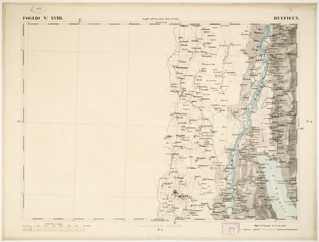 "...DI S. M. IL RE DI SARDEGNA ALLA SCALA DI 1:50.000. OPERA DEL CORPO REALE DELLO STATO MAGGIORE. Riproduzione litografica in nero e azzurro per le acque della carta già descritta al N° 97 d'ordine (Cart. d'Arch. n. 18 e 19. Docum. n. 21). Annessi due quadri d'unione alle scale di 1:1.000.000 e di 1:1.500.000, con indicazione delle varianti nei segni convenzionali sui fogli riveduti e corretti. Una parte del territorio fa parte dell'attuale Francia e Svizzera. L'edizione della carta al numero d'inventario 81 è stata passata in carico allo S.M.E. a Roma al numero d'inventario 82 vi è un'edizione composta da 87 fogli. Vi è una copia alla cartella d'archivio n. 44 documento n. 77."