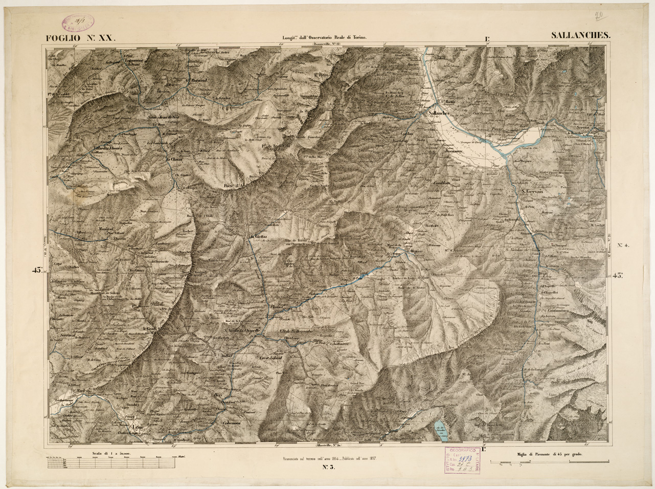 "...DI S. M. IL RE DI SARDEGNA ALLA SCALA DI 1:50.000. OPERA DEL CORPO REALE DELLO STATO MAGGIORE. Riproduzione litografica in nero e azzurro per le acque della carta già descritta al N° 97 d'ordine (Cart. d'Arch. n. 18 e 19. Docum. n. 21). Annessi due quadri d'unione alle scale di 1:1.000.000 e di 1:1.500.000, con indicazione delle varianti nei segni convenzionali sui fogli riveduti e corretti. Una parte del territorio fa parte dell'attuale Francia e Svizzera. L'edizione della carta al numero d'inventario 81 è stata passata in carico allo S.M.E. a Roma al numero d'inventario 82 vi è un'edizione composta da 87 fogli. Vi è una copia alla cartella d'archivio n. 44 documento n. 77."
