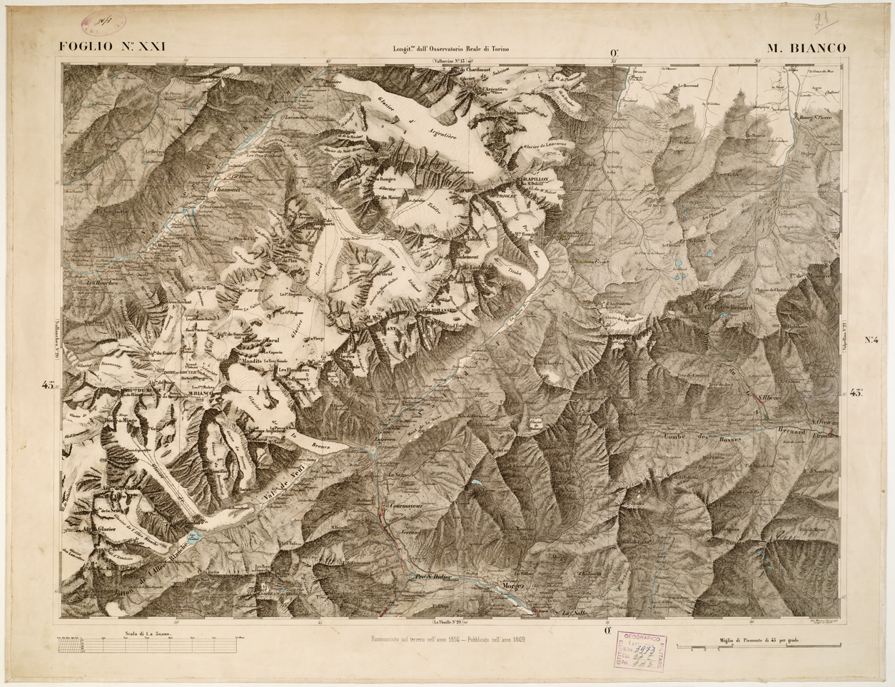 "...DI S. M. IL RE DI SARDEGNA ALLA SCALA DI 1:50.000. OPERA DEL CORPO REALE DELLO STATO MAGGIORE. Riproduzione litografica in nero e azzurro per le acque della carta già descritta al N° 97 d'ordine (Cart. d'Arch. n. 18 e 19. Docum. n. 21). Annessi due quadri d'unione alle scale di 1:1.000.000 e di 1:1.500.000, con indicazione delle varianti nei segni convenzionali sui fogli riveduti e corretti. Una parte del territorio fa parte dell'attuale Francia e Svizzera. L'edizione della carta al numero d'inventario 81 è stata passata in carico allo S.M.E. a Roma al numero d'inventario 82 vi è un'edizione composta da 87 fogli. Vi è una copia alla cartella d'archivio n. 44 documento n. 77."