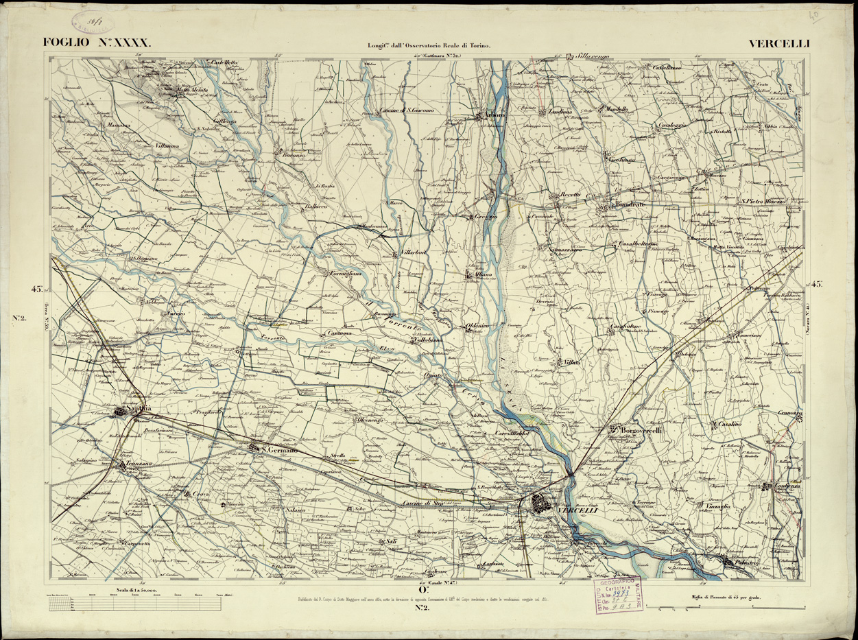"...DI S. M. IL RE DI SARDEGNA ALLA SCALA DI 1:50.000. OPERA DEL CORPO REALE DELLO STATO MAGGIORE. Riproduzione litografica in nero e azzurro per le acque della carta già descritta al N° 97 d'ordine (Cart. d'Arch. n. 18 e 19. Docum. n. 21). Annessi due quadri d'unione alle scale di 1:1.000.000 e di 1:1.500.000, con indicazione delle varianti nei segni convenzionali sui fogli riveduti e corretti. Una parte del territorio fa parte dell'attuale Francia e Svizzera. L'edizione della carta al numero d'inventario 81 è stata passata in carico allo S.M.E. a Roma al numero d'inventario 82 vi è un'edizione composta da 87 fogli. Vi è una copia alla cartella d'archivio n. 44 documento n. 77."