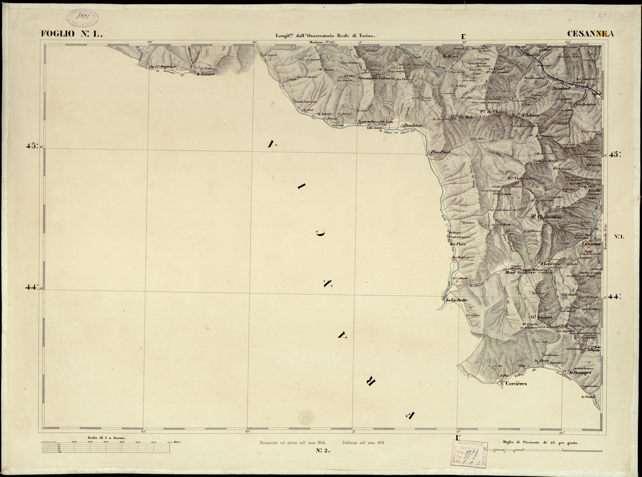 "...DI S. M. IL RE DI SARDEGNA ALLA SCALA DI 1:50.000. OPERA DEL CORPO REALE DELLO STATO MAGGIORE. Riproduzione litografica in nero e azzurro per le acque della carta già descritta al N° 97 d'ordine (Cart. d'Arch. n. 18 e 19. Docum. n. 21). Annessi due quadri d'unione alle scale di 1:1.000.000 e di 1:1.500.000, con indicazione delle varianti nei segni convenzionali sui fogli riveduti e corretti. Una parte del territorio fa parte dell'attuale Francia e Svizzera. L'edizione della carta al numero d'inventario 81 è stata passata in carico allo S.M.E. a Roma al numero d'inventario 82 vi è un'edizione composta da 87 fogli. Vi è una copia alla cartella d'archivio n. 44 documento n. 77."