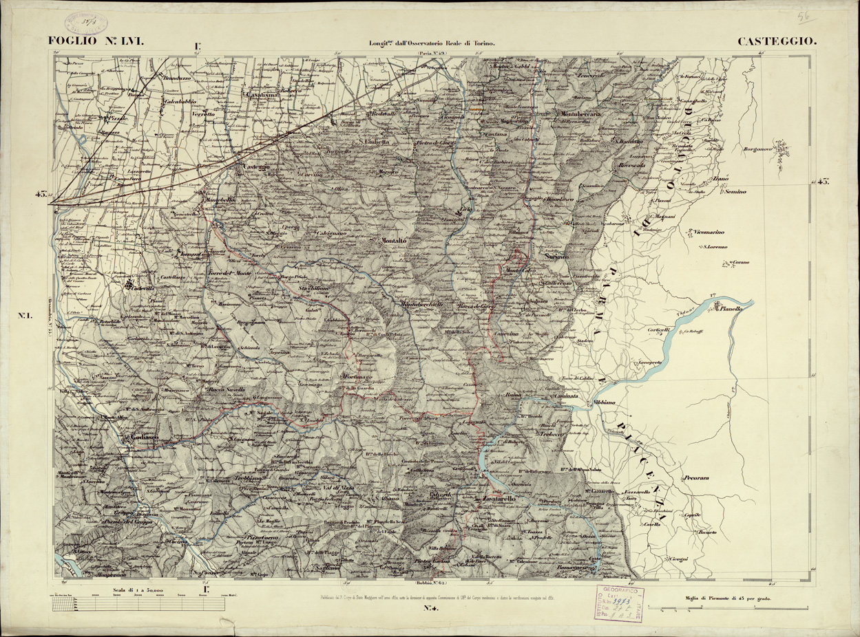 "...DI S. M. IL RE DI SARDEGNA ALLA SCALA DI 1:50.000. OPERA DEL CORPO REALE DELLO STATO MAGGIORE. Riproduzione litografica in nero e azzurro per le acque della carta già descritta al N° 97 d'ordine (Cart. d'Arch. n. 18 e 19. Docum. n. 21). Annessi due quadri d'unione alle scale di 1:1.000.000 e di 1:1.500.000, con indicazione delle varianti nei segni convenzionali sui fogli riveduti e corretti. Una parte del territorio fa parte dell'attuale Francia e Svizzera. L'edizione della carta al numero d'inventario 81 è stata passata in carico allo S.M.E. a Roma al numero d'inventario 82 vi è un'edizione composta da 87 fogli. Vi è una copia alla cartella d'archivio n. 44 documento n. 77."