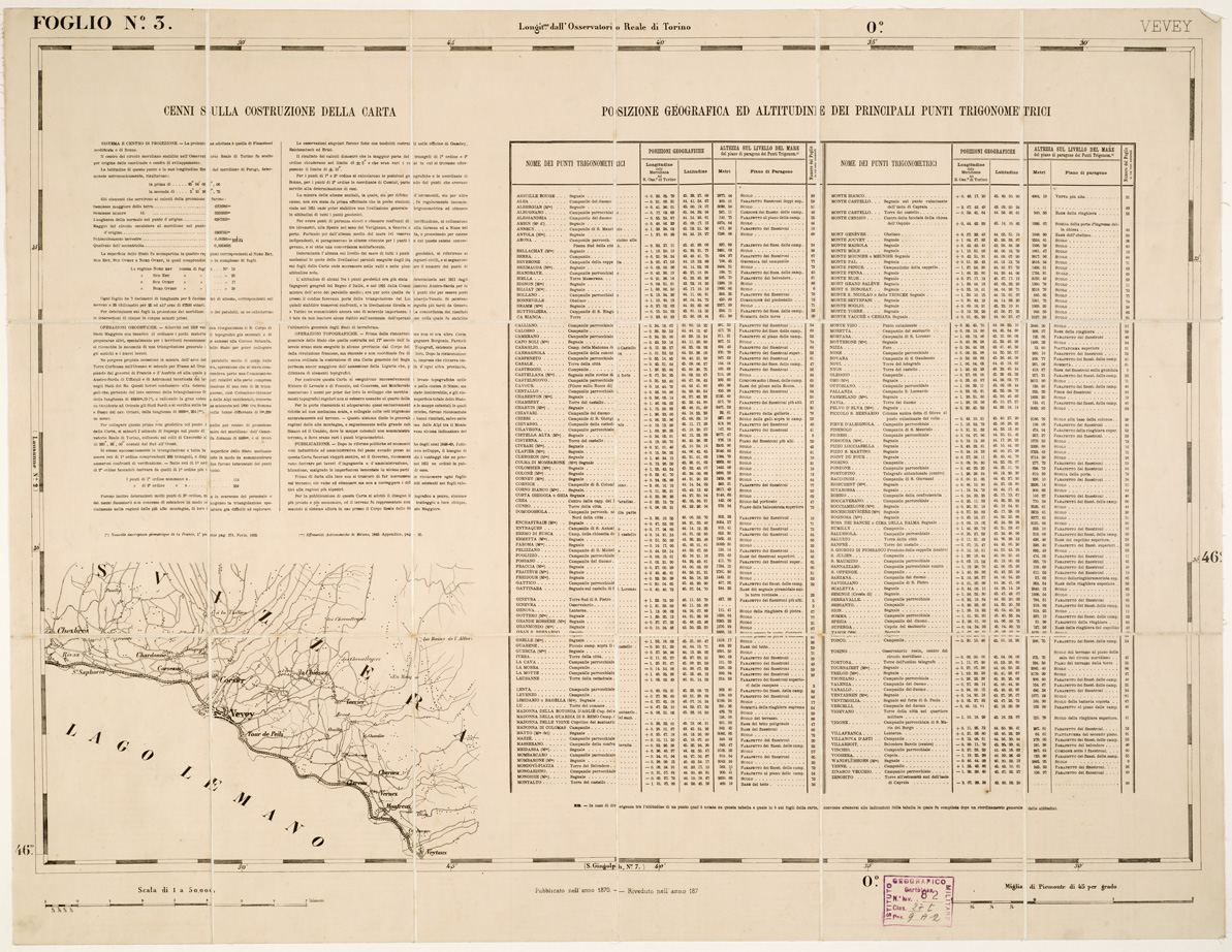 "...DI S. M. IL RE DI SARDEGNA ALLA SCALA DI 1:50.000. OPERA DEL CORPO REALE DELLO STATO MAGGIORE. Riproduzione litografica in nero e azzurro per le acque della carta già descritta al N° 97 d'ordine (Cart. d'Arch. n. 18 e 19. Docum. n. 21). Annessi due quadri d'unione alle scale di 1:1.000.000 e di 1:1.500.000, con indicazione delle varianti nei segni convenzionali sui fogli riveduti e corretti. Una parte del territorio fa parte dell'attuale Francia e Svizzera. L'edizione della carta al numero d'inventario 81 è stata passata in carico allo S.M.E. a Roma al numero d'inventario 3973 vi è un'edizione composta 93 fogli. Vi è una copia alla cartella d'archivio n. 44 documento n. 77."