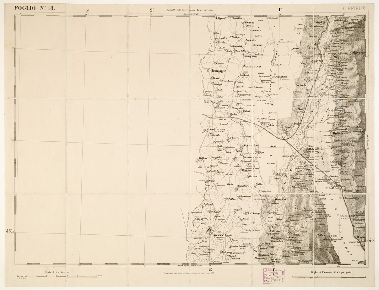 "...DI S. M. IL RE DI SARDEGNA ALLA SCALA DI 1:50.000. OPERA DEL CORPO REALE DELLO STATO MAGGIORE. Riproduzione litografica in nero e azzurro per le acque della carta già descritta al N° 97 d'ordine (Cart. d'Arch. n. 18 e 19. Docum. n. 21). Annessi due quadri d'unione alle scale di 1:1.000.000 e di 1:1.500.000, con indicazione delle varianti nei segni convenzionali sui fogli riveduti e corretti. Una parte del territorio fa parte dell'attuale Francia e Svizzera. L'edizione della carta al numero d'inventario 81 è stata passata in carico allo S.M.E. a Roma al numero d'inventario 3973 vi è un'edizione composta 93 fogli. Vi è una copia alla cartella d'archivio n. 44 documento n. 77."
