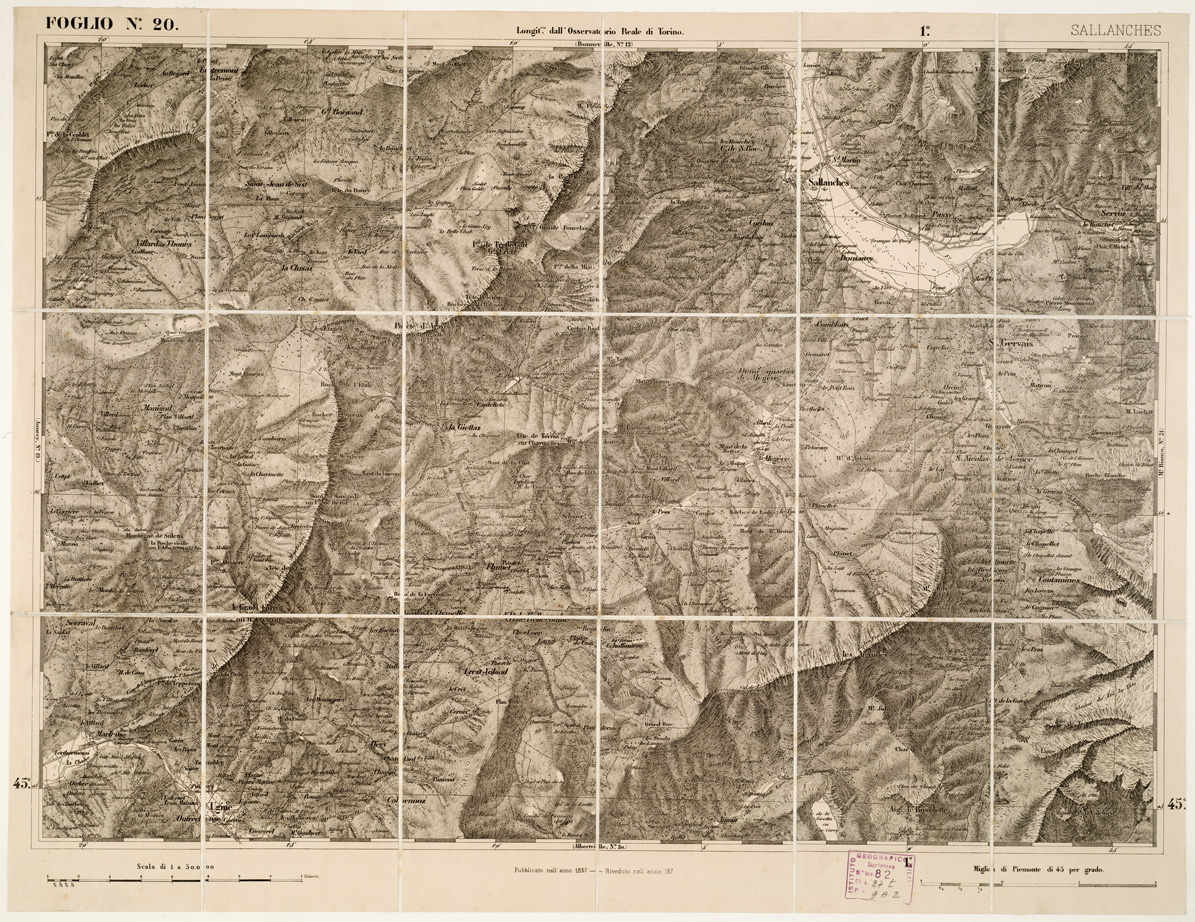 "...DI S. M. IL RE DI SARDEGNA ALLA SCALA DI 1:50.000. OPERA DEL CORPO REALE DELLO STATO MAGGIORE. Riproduzione litografica in nero e azzurro per le acque della carta già descritta al N° 97 d'ordine (Cart. d'Arch. n. 18 e 19. Docum. n. 21). Annessi due quadri d'unione alle scale di 1:1.000.000 e di 1:1.500.000, con indicazione delle varianti nei segni convenzionali sui fogli riveduti e corretti. Una parte del territorio fa parte dell'attuale Francia e Svizzera. L'edizione della carta al numero d'inventario 81 è stata passata in carico allo S.M.E. a Roma al numero d'inventario 3973 vi è un'edizione composta 93 fogli. Vi è una copia alla cartella d'archivio n. 44 documento n. 77."