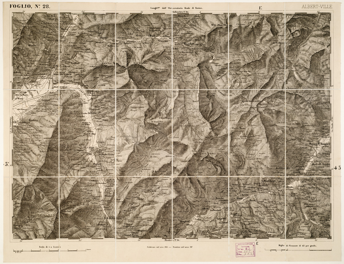 "...DI S. M. IL RE DI SARDEGNA ALLA SCALA DI 1:50.000. OPERA DEL CORPO REALE DELLO STATO MAGGIORE. Riproduzione litografica in nero e azzurro per le acque della carta già descritta al N° 97 d'ordine (Cart. d'Arch. n. 18 e 19. Docum. n. 21). Annessi due quadri d'unione alle scale di 1:1.000.000 e di 1:1.500.000, con indicazione delle varianti nei segni convenzionali sui fogli riveduti e corretti. Una parte del territorio fa parte dell'attuale Francia e Svizzera. L'edizione della carta al numero d'inventario 81 è stata passata in carico allo S.M.E. a Roma al numero d'inventario 3973 vi è un'edizione composta 93 fogli. Vi è una copia alla cartella d'archivio n. 44 documento n. 77."