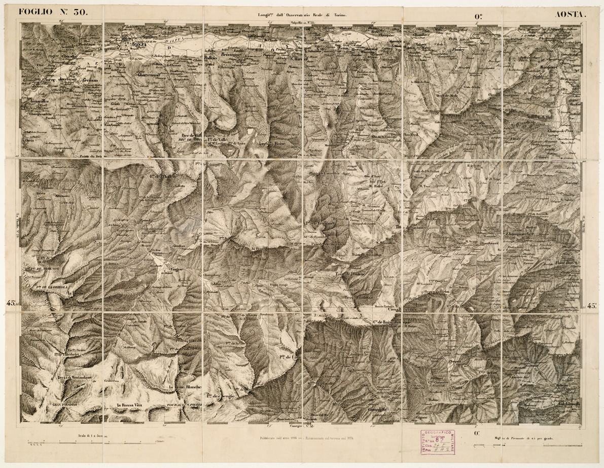 "...DI S. M. IL RE DI SARDEGNA ALLA SCALA DI 1:50.000. OPERA DEL CORPO REALE DELLO STATO MAGGIORE. Riproduzione litografica in nero e azzurro per le acque della carta già descritta al N° 97 d'ordine (Cart. d'Arch. n. 18 e 19. Docum. n. 21). Annessi due quadri d'unione alle scale di 1:1.000.000 e di 1:1.500.000, con indicazione delle varianti nei segni convenzionali sui fogli riveduti e corretti. Una parte del territorio fa parte dell'attuale Francia e Svizzera. L'edizione della carta al numero d'inventario 81 è stata passata in carico allo S.M.E. a Roma al numero d'inventario 3973 vi è un'edizione composta 93 fogli. Vi è una copia alla cartella d'archivio n. 44 documento n. 77."
