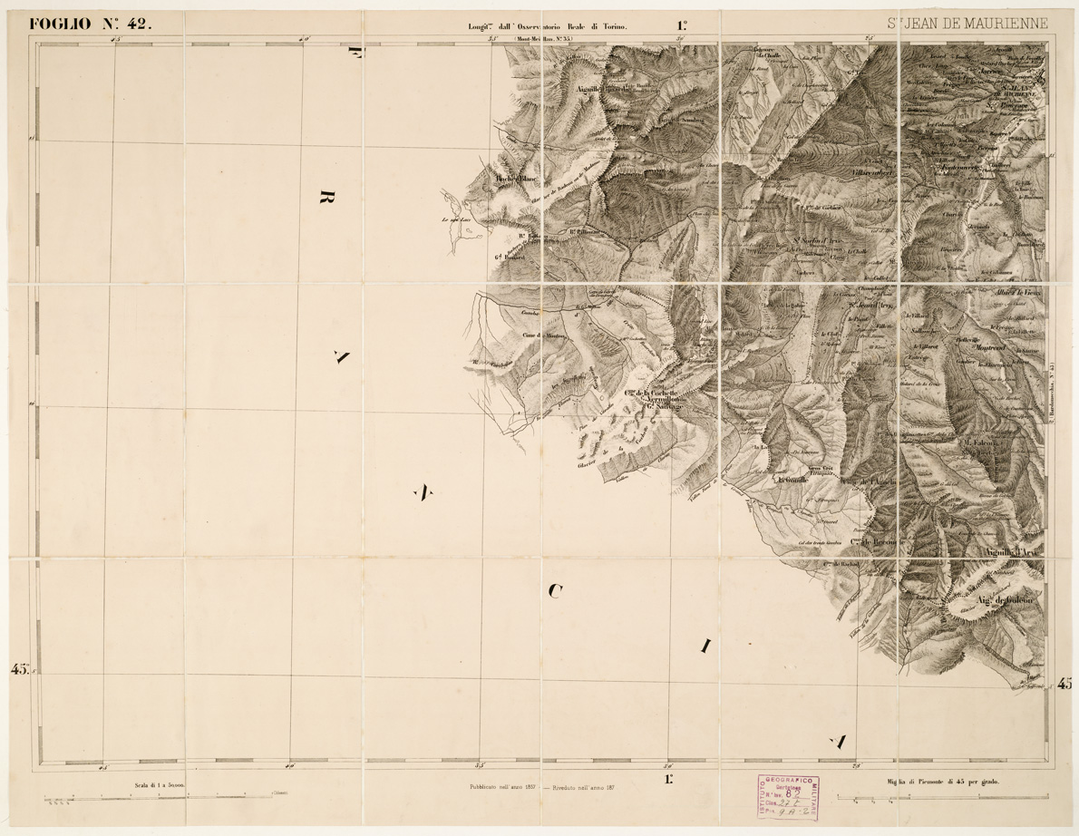 "...DI S. M. IL RE DI SARDEGNA ALLA SCALA DI 1:50.000. OPERA DEL CORPO REALE DELLO STATO MAGGIORE. Riproduzione litografica in nero e azzurro per le acque della carta già descritta al N° 97 d'ordine (Cart. d'Arch. n. 18 e 19. Docum. n. 21). Annessi due quadri d'unione alle scale di 1:1.000.000 e di 1:1.500.000, con indicazione delle varianti nei segni convenzionali sui fogli riveduti e corretti. Una parte del territorio fa parte dell'attuale Francia e Svizzera. L'edizione della carta al numero d'inventario 81 è stata passata in carico allo S.M.E. a Roma al numero d'inventario 3973 vi è un'edizione composta 93 fogli. Vi è una copia alla cartella d'archivio n. 44 documento n. 77."