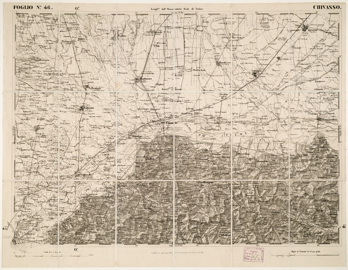 "...DI S. M. IL RE DI SARDEGNA ALLA SCALA DI 1:50.000. OPERA DEL CORPO REALE DELLO STATO MAGGIORE. Riproduzione litografica in nero e azzurro per le acque della carta già descritta al N° 97 d'ordine (Cart. d'Arch. n. 18 e 19. Docum. n. 21). Annessi due quadri d'unione alle scale di 1:1.000.000 e di 1:1.500.000, con indicazione delle varianti nei segni convenzionali sui fogli riveduti e corretti. Una parte del territorio fa parte dell'attuale Francia e Svizzera. L'edizione della carta al numero d'inventario 81 è stata passata in carico allo S.M.E. a Roma al numero d'inventario 3973 vi è un'edizione composta 93 fogli. Vi è una copia alla cartella d'archivio n. 44 documento n. 77."
