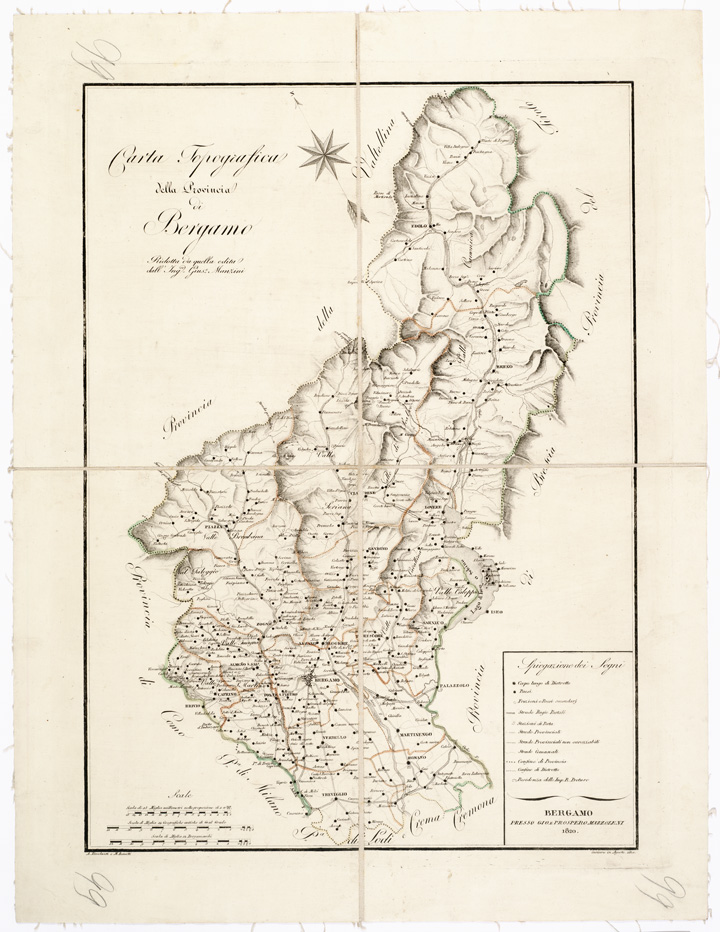 CARTA TOPOGRAFICA DELLA PROVINCIA DI BERGAMO RIDOTTA DA QUELLA EDITA DALL'ING. GIUSEPPE MANZINI A. RIVELANTI E M. BONATTI, INCISERO IN AGOSTO 1820. BERGAMO PRESSO GIO. E PROSPERO MAZZOLENI.