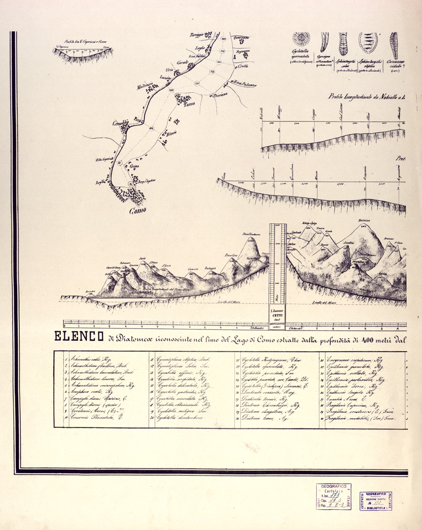 "...PER CURA DEL CAV. DOTT. CASELLA GIUSEPPE. Rappresentazione orografica prospettica. In basso è presente l'elenco di diatomeae riconosciute nel limo del Lago di Como estratte dalla profondità di 400 metri dal Dottore Cav. Giuseppe Casella e studiate dall'Abate Francesco Castracane. Vi sono anche dei disegni di diatomeae che si trovano nel limo del fondo riscontrate ed esaminate dal sig. Dott. Vittorio Giudi."