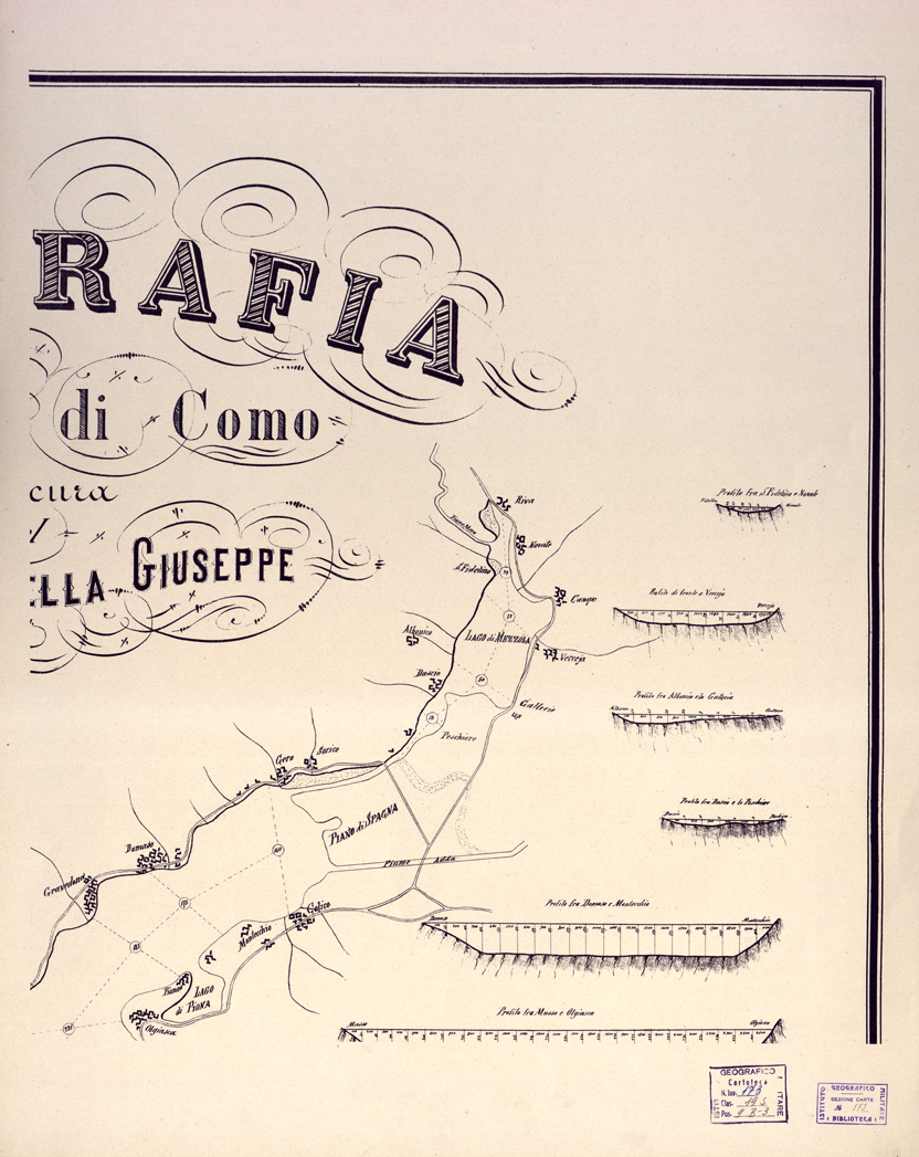 "...PER CURA DEL CAV. DOTT. CASELLA GIUSEPPE. Rappresentazione orografica prospettica. In basso è presente l'elenco di diatomeae riconosciute nel limo del Lago di Como estratte dalla profondità di 400 metri dal Dottore Cav. Giuseppe Casella e studiate dall'Abate Francesco Castracane. Vi sono anche dei disegni di diatomeae che si trovano nel limo del fondo riscontrate ed esaminate dal sig. Dott. Vittorio Giudi."