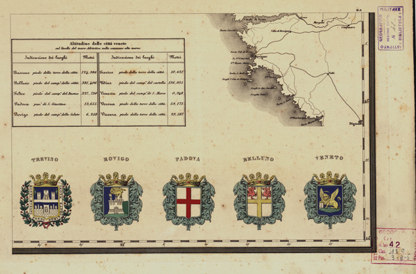 "... DIVISA IN 48 FOGLI SULL'AMPIA SCALA DI 1:172.800 DEL NATURALE COLL'INDICAZIONE DELLE DISTANZE CHE CORRONO DA PAESE A PAESE SEGNATE SOPRA OGNI TRONCO DI STRADA IN MIGLIA GEOGRAFICHE ITALIANE DA 60 AL GRADO. COMPILATA DA ALESSANDRO MARIDATI. RIVEDUTA E AUTENTICATA DAI SINGOLI I. I. R. R. UFFICI PROVINCIALI DELLE PUBBLICHE COSTRUZIONI. MILANO 1858. Bella carta tratta da nitida incisione su rame stampata in nero con confini politici a colori. L'orografia è dimostrata a mezzo di fine tratteggio a luce obliqua. Alcuni dei fogli contengono piante delle città principali con annesso elenco numerico delle costruzioni principali. Altri contengono tabelle statistico-amministrative, elenchi delle coordinate dei luoghi più importanti, quadri e notizie intorno alla navigazione dei canali, i servizi ferroviari e telegrafici, ecc., il foglio E2 contiene una tavola dimostrativa in 1/4 il numero delle poste stabilito dell'una all'altra stazione nel Regno Lombardo Veneto colle relative competenze in base alla vigente tariffa. Due copie."