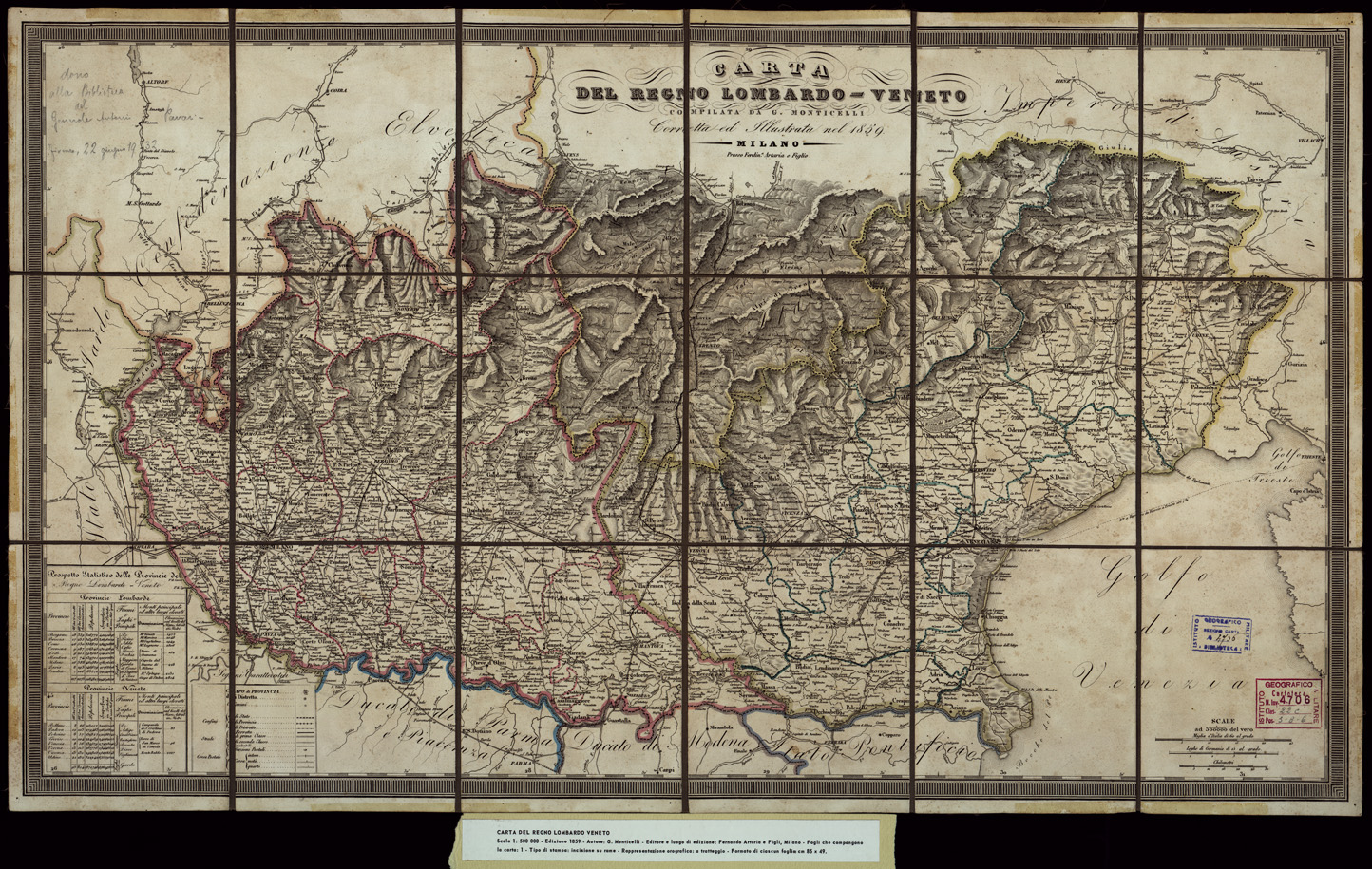 CARTA DEL REGNO LOMBARDO - VENETO COMPILATA DA G. MONTICELLI CORRETTA ED ILLUSTRATA NEL 1859. MILANO, PRESSO FERD. ARTARIA E FIGLIO