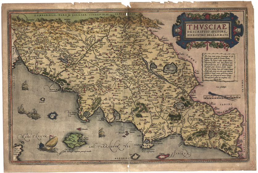 "Tav.I-4: Disegno inciso su rame a vari colori, bene conservato. Il territorio è delimitato a nord dalla displuviale appenninica della Toscana, ad est dal corso del Tevere fino alla foce, a sud dalle isole del Giglio e di Giannutri, ad ovest dalla Magra comprendendo il lembo nord- orientale della Corsica. Sul retro dlla carta, File B0004394, la descrizione dell'area rappresentata. Il Documento contiene 7 tavole dell'Atlante pubblicato nel 1570 da Abramo Ortelio, dotto geografo e sommo cartografo, detto il Tolomeo del suo secolo, amico di Gerardo Mercatore, nato ad Anversa nel 1527, morto nel 1598. Altre edizioni di questo Atlante si ebbero nel 1571, nel 1573, nel 1592 e nel 1595 in queste il numero delle tavole andò via via aumentando da 53 della edizione primitiva, a 115 in quella del 1595. Nel 1608 Filippo Pigafetta pubblicò ad Anversa una edizione italiana di 127 tavole. Le tavole della prima edizione sono state incise da Francesco Hogenberg. Il documento è composto dalle seguenti Tavole: Tavola I-0: LARII LACUS, VULGO COMENSIS - FORII JULII, VULGO FRIVLI TYPUS - TERRITORII ROMANI DESCRIPT. - File B0008727 Tavola I-1: ITALIAE NOVISSIMA DESCRIPTIO AUTORE IACOPO CASTALDO PEDEMONTANO Tavola I-2: ITALIAE NOVISSIMA DESCRIPTIO AUTORE IACOPO CASTALDO PEDEMONTANO - File B0008728 Tavola I-3: ITALIA GALLICA SIVE GALLIA CISALPINA, EX CONATIBUS GEOGRAPHICIS ABRAH. ORTELIJ - File B0008175 Tavola I-4: THUSCIAE DESCRIPTIO AUCTORE HIERONIMO BELLARMATO - File B0004393-94 Tavola I-5: TUSCIAE ANTIQUAE TYPUS EX CONATIBUS GEOGRAPHICIS ABRAH. ORTELIJ - File B0000104 Tavola I-6: PERUSINI AGRI EXACTISSIMA NOVISSIMAQUE DESCRIPTIO: AUCTORE EGNATIO DANTE - File B0005508 Tavola I-7: SENENSIS DITIONIS, ACCURATA DESCRIP. - File B0014062-63"