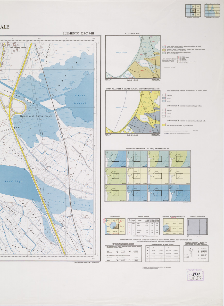 "Rappresentazione orografica a curve di livello, l'equidistanza fra le curve di livello: metri 5 per le curve a tratti metri 1. Altimetria espressa in metri e riferita al livello medio del mare (mareografo di Cagliari). Ripresa aerea, inquadramento geodetico e triangolazione aerea: I.G.M. restituzione aereofotogrammetrica, ricognizione e disegno: Impresa I. Benedetti (FI). Impianto cromo-fotolitografico: Geographicus (FI). Stampa: Pubbligraf, Napoli."
