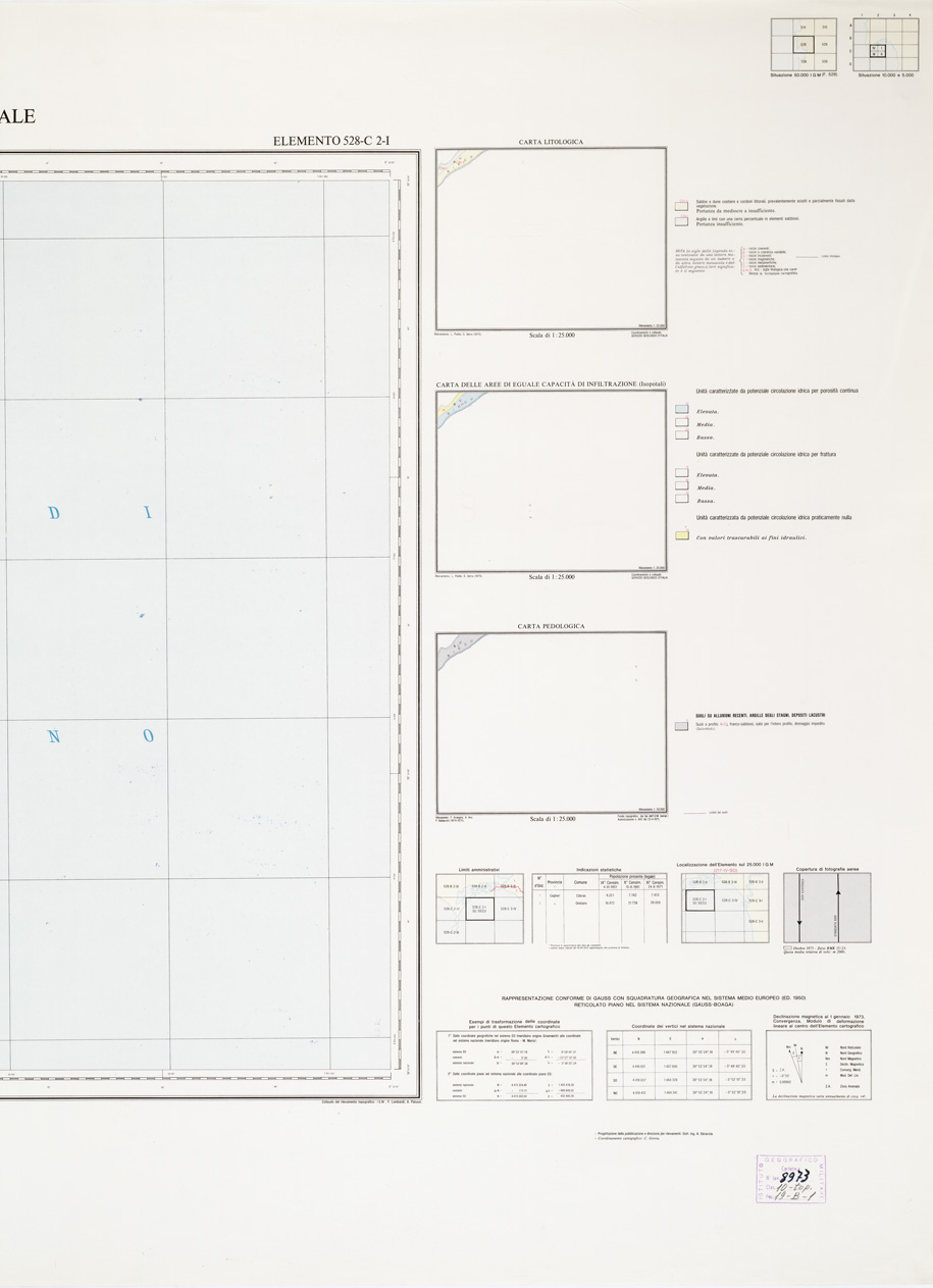 "Rappresentazione orografica a curve di livello, l'equidistanza fra le curve di livello: metri 5 per le curve a tratti metri 1. Altimetria espressa in metri e riferita al livello medio del mare (mareografo di Cagliari). Ripresa aerea, inquadramento geodetico e triangolazione aerea: I.G.M. restituzione aereofotogrammetrica, ricognizione e disegno: Aerofotogrammetria Ing. Barigazzi & C. s.n.c., Parma. Impianto cromo-fotolitografico: Ordis, Piacenza. Stampa: Pubbligraf, Napoli."