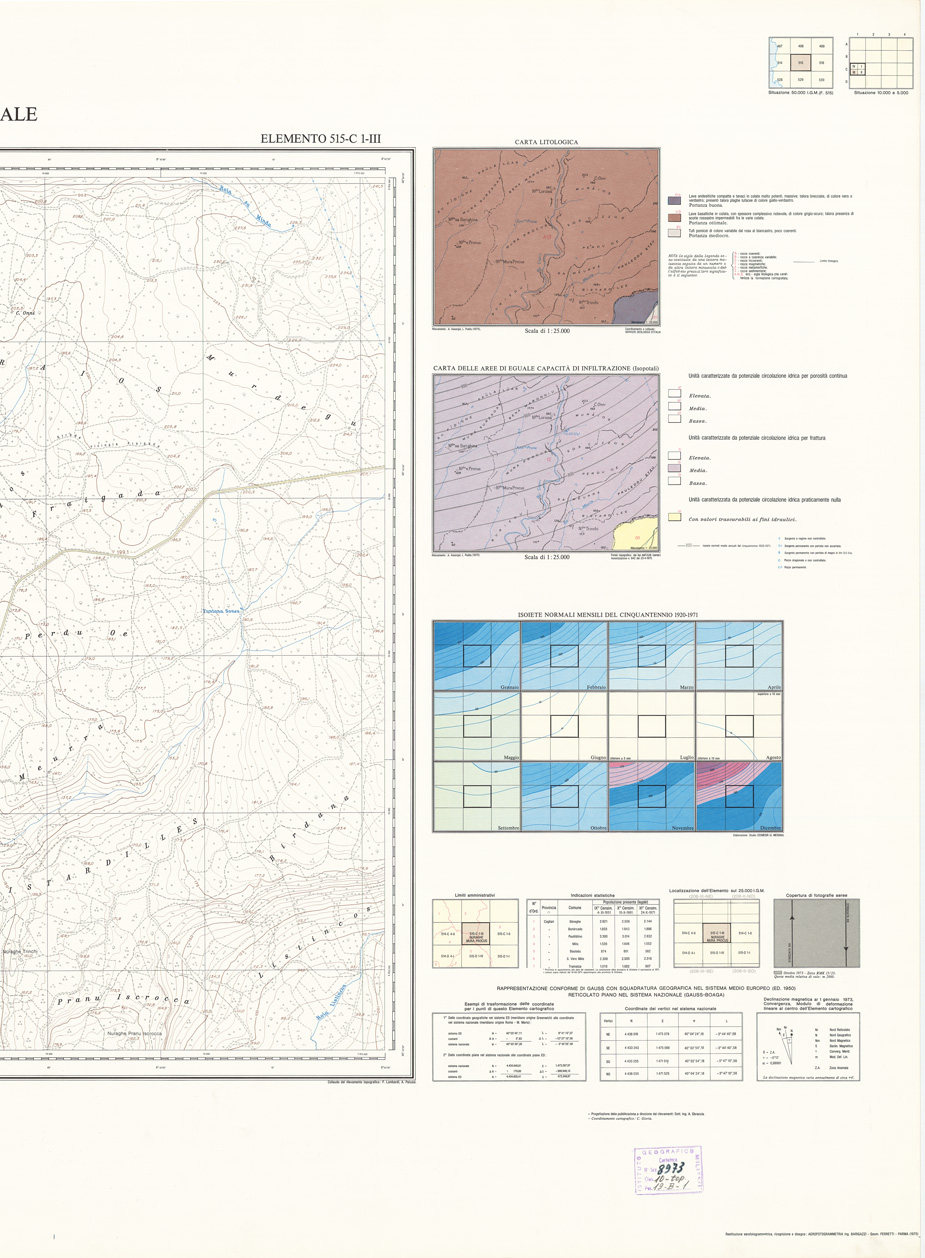 "Rappresentazione orografica a curve di livello, l'equidistanza fra le curve di livello: metri 5 per le curve a tratti metri 1. Altimetria espressa in metri e riferita al livello medio del mare (mareografo di Cagliari). Ripresa aerea, inquadramento geodetico e triangolazione aerea: I.G.M. (FI). Impianto fotolitografico: Ordis, Piacenza. Stampa: Pubbligraf, Napoli."