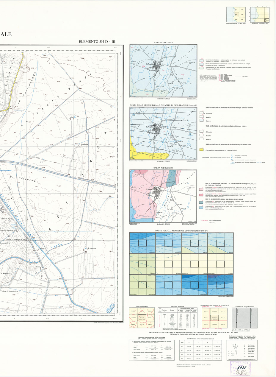 "Rappresentazione orografica a curve di livello, l'equidistanza fra le curve di livello: metri 5 per le curve a tratti metri 1. Altimetria espressa in metri e riferita al livello medio del mare (mareografo di Cagliari). Ripresa aerea, inquadramento geodetico e triangolazione aerea: I.G.M. restituzione aereofotogrammetrica, ricognizione e disegno: Aerofotogrammetria Ing. Barigazzi & C. s.n.c., Parma. Impianto cromo-fotolitografico: Ordis, Piacenza. Stampa: Pubbligraf, Napoli."