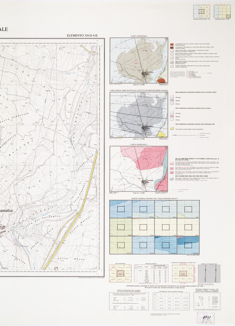 "Rappresentazione orografica a curve di livello, l'equidistanza fra le curve di livello: metri 5 per le curve a tratti metri 1. Altimetria espressa in metri e riferita al livello medio del mare (mareografo di Cagliari). Ripresa aerea, inquadramento geodetico e triangolazione aerea: I.G.M. restituzione aereofotogrammetrica, ricognizione e disegno: Aerofotogrammetria Ing. Barigazzi & C. s.n.c., Parma. Impianto cromo-fotolitografico: Ordis, Piacenza. Stampa: Pubbligraf, Napoli."